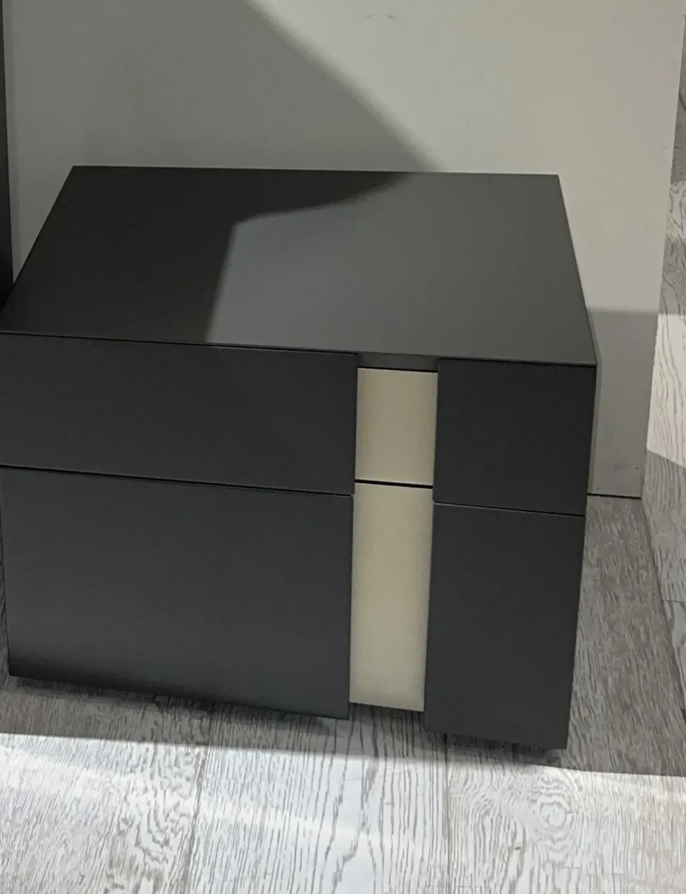 Comodino di Presotto modello Inside, struttura laccato opaco con inserto in metallo, dimensioni larghezza 46 cm , h 37,6 cm e p. 43,6.