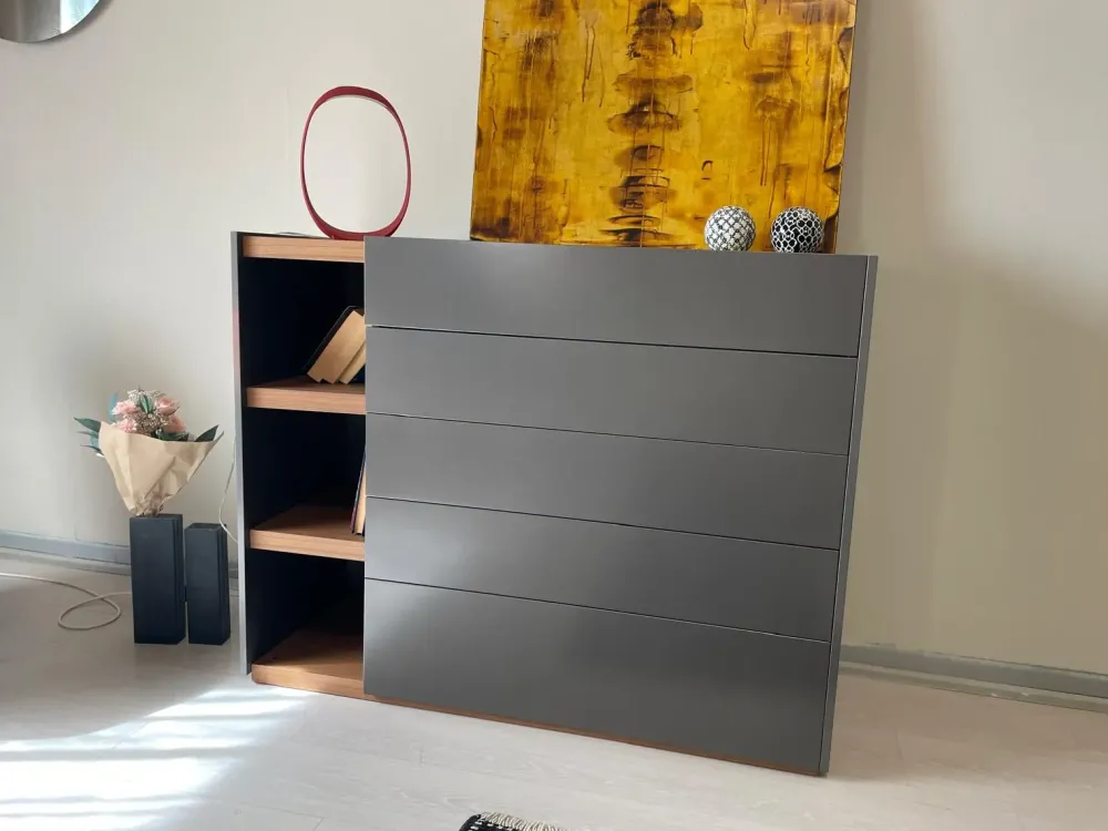 Set comò composto da n.4 cassetti e vano a giorno laterale, n.2 comodini L60cm con doppio cassetto.