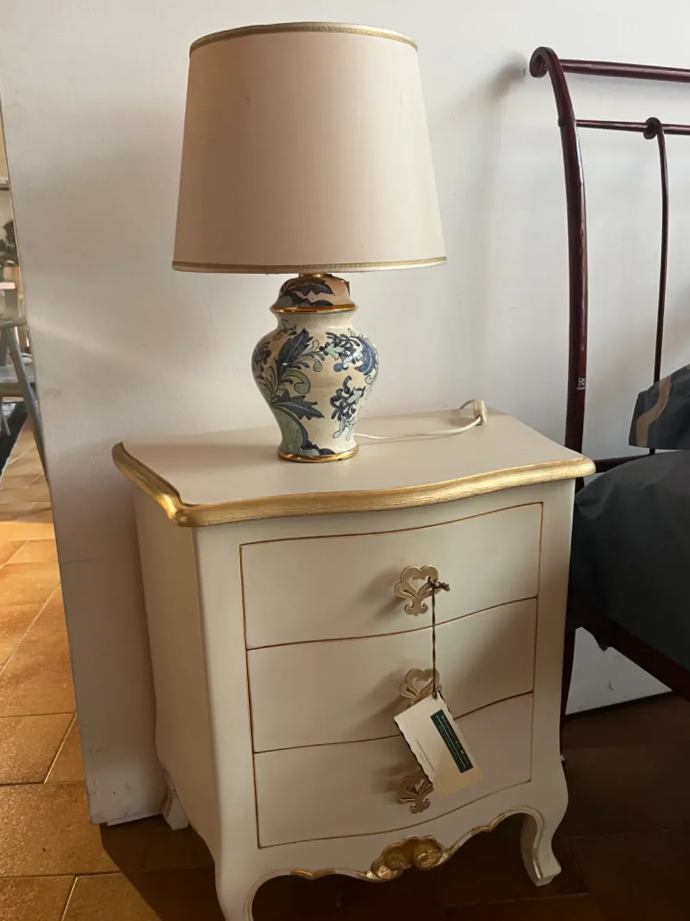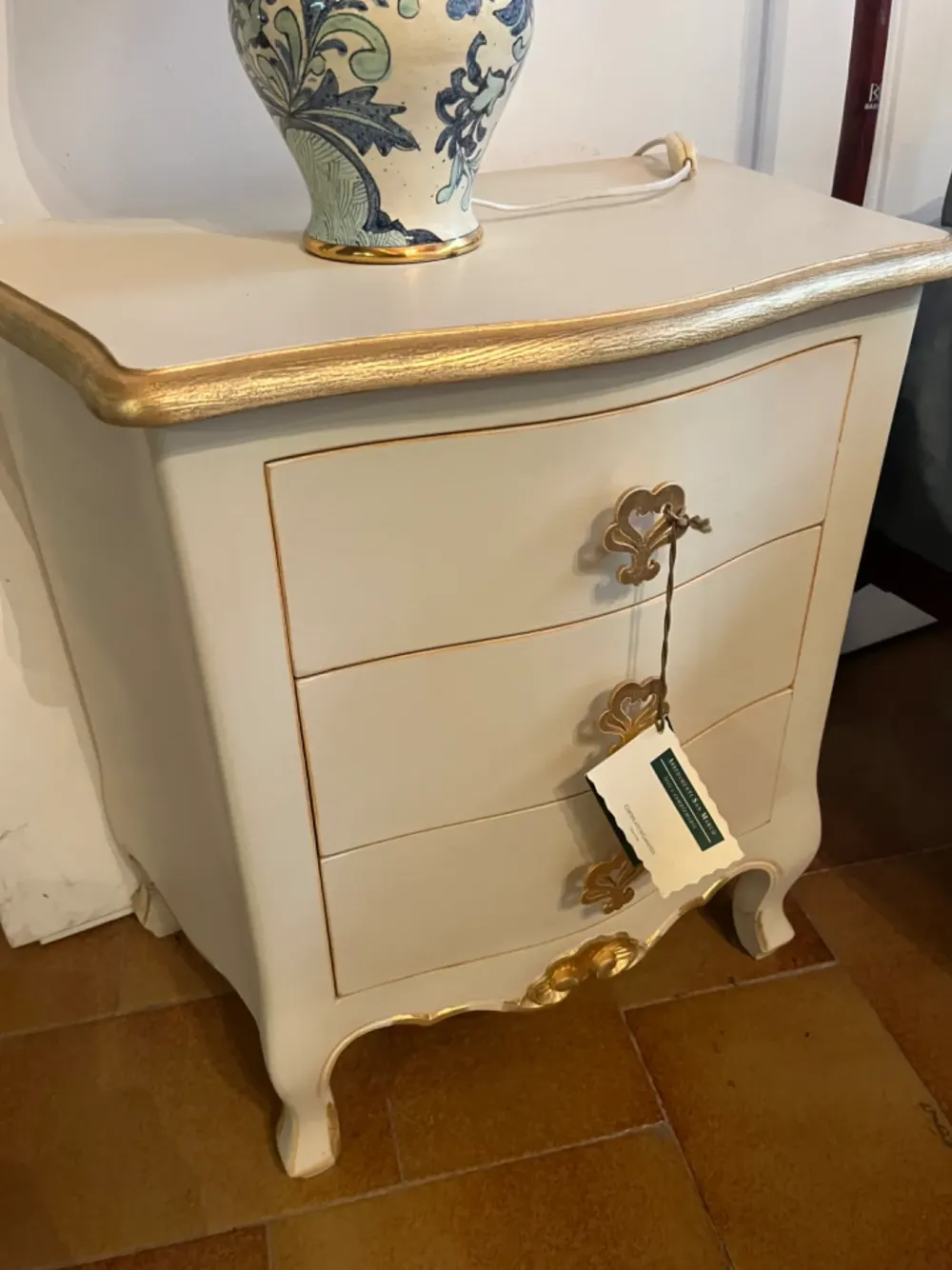 Due comodini il laccato bianco miele anticato , bordi foglia oro cm 57 x 35 x 60