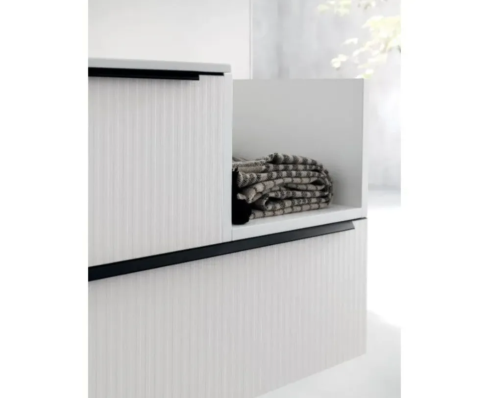Particolare composizione mobile bagno mod. B201, in finitura materica Laos (rigato) bianco opaco e con vani a giorno bianchi opaco lisci, con maniglia profilo fissata sul bordo superiore del cassetto, lunghezza totale 141 cm, profondità 51,50 cm e completa di: doppia base portalavabo a cassettone (posizionate sfalsate come foto), due vani a giorno, top con vasca integrata mod. Style in Mineralguss bianco opaco e specchiera mod. Sfera retroilluminata a Led. Miscelatore e lampada a sospensione esclusi. La composizione può essere realizzata in altri colori a scelta campionario. TRASPORTO E MONTAGGIO ESCLUSI.