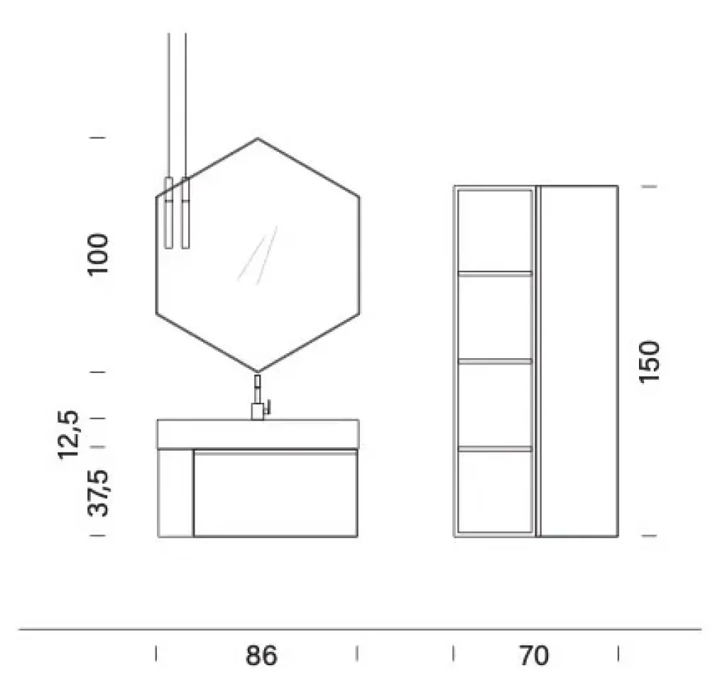 Dimensioni composizione: L 86+70 x P 46/20,8 cm (vedi disegno).