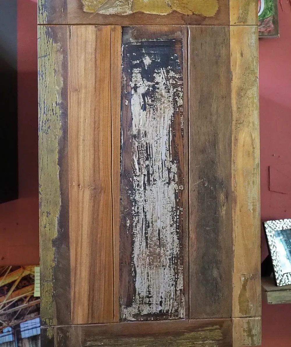 le ante di questo bellissimo e particolare composizioine soggiorno a paretwe in stile recicle sono realizzate in vero legnom indiano .