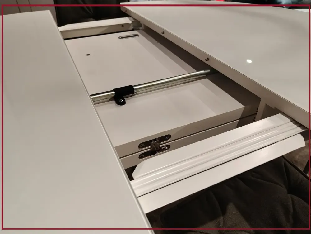 Ma il suo vero punto di forza è la pratica allunga centrale a libro, che permette di estendere il piano fino a 165 cm, accogliendo fino a otto commensali senza sacrificare lo stile.