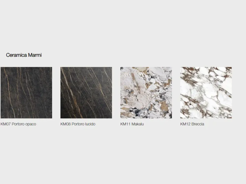 Piano in ceramica Marmi nei colori Portoro opaco (KM07), Portoro lucido (KM08), Makalu (KM11) o Breccia (KM12).