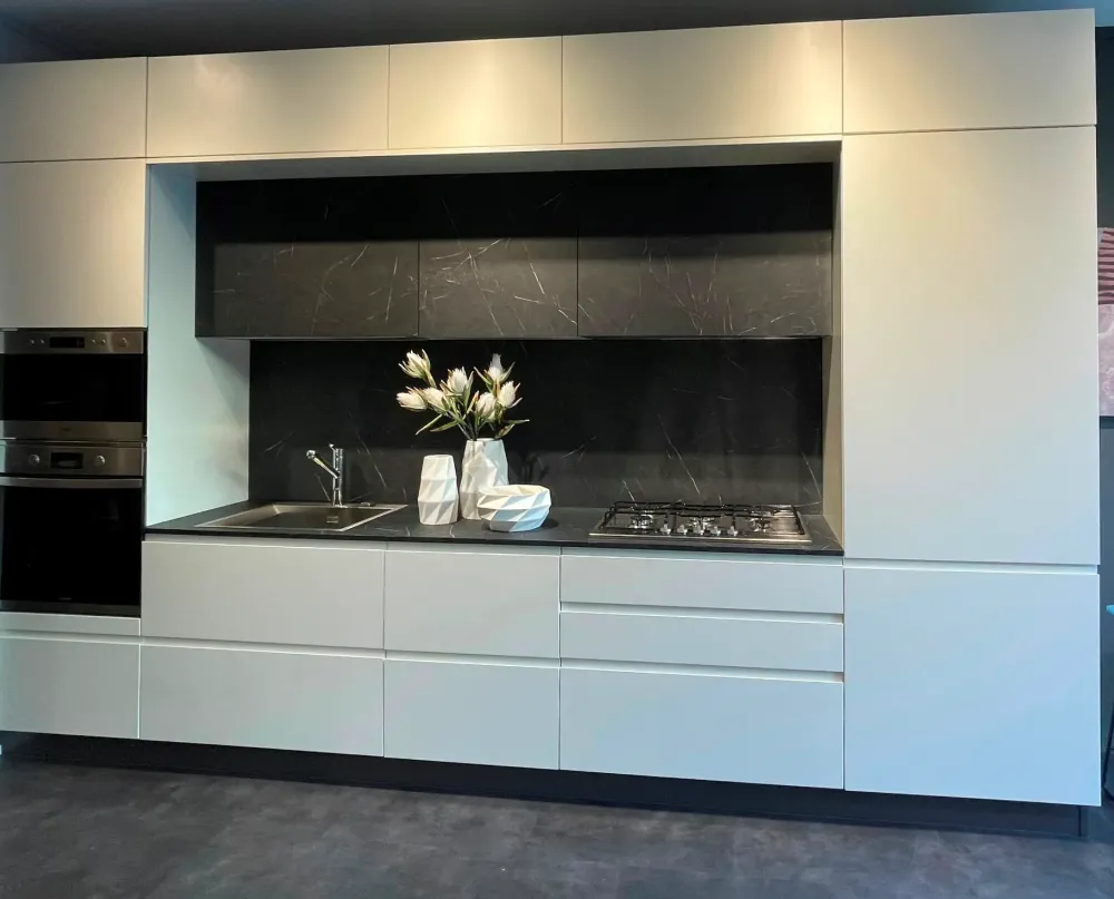cucina modello Traccia di febal casa composizione lineare 375cm frontale laccato opaco bianco e nobilitato venato grey sui pensili a vasistas composizione con pensili sopra colonna, colonna frigo incasso da 75cm,colonna doppio forno, lavastoviglie incassata, piano cottura inox, lavello monovasca + miscelatore, top in laminato sp 2cm e schienale in tinta.