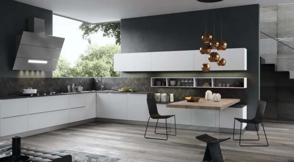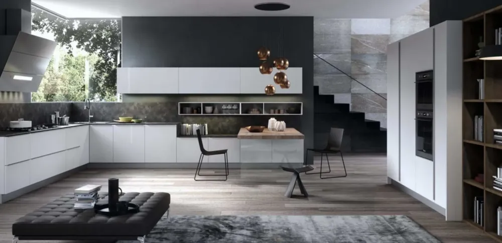 - Materiale laccato lucido, colore bianco e disposizione ad angolo: K18 lucida Antares è una cucina che unisce stile e design.