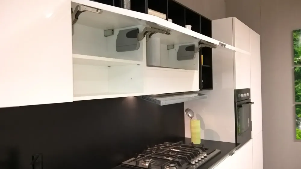 La cappa di questa cucina bianca lineare ha un disegno poco invasivo. È completamente a scomparsa nel pensile molto pratica e si aziona aprendo un frontalino scorrevole in vetro.