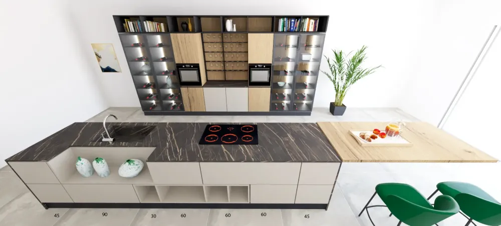 Questa cucina Kali è disposta con isola, ma potremo indicarti anche ulteriori disposizioni, sempre ideali per te ed in materiali durevoli.