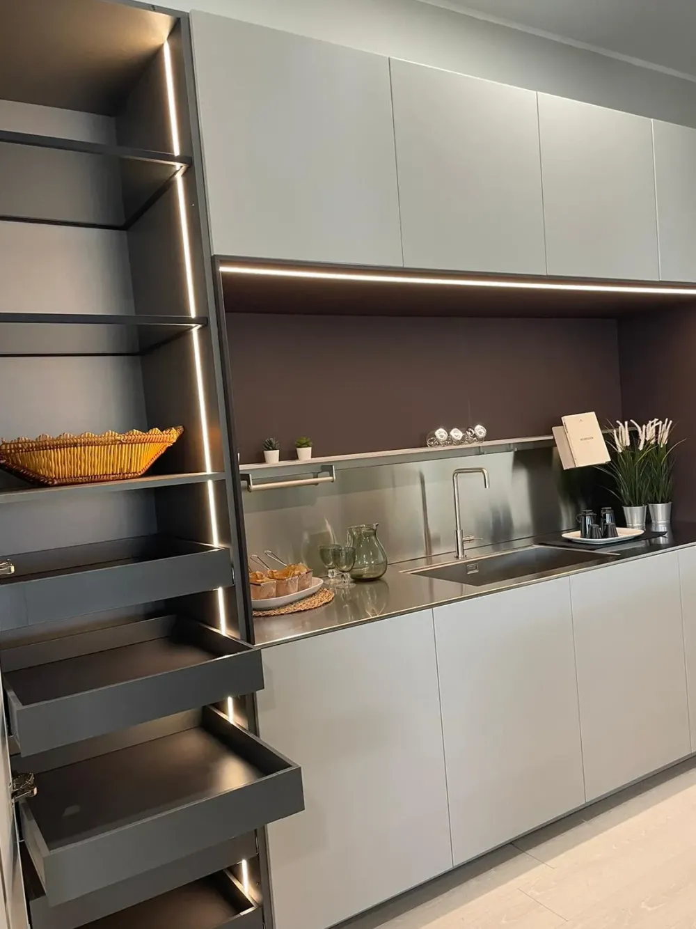 Tutte le ante in finitura fenix grigio chiaro piano in acciaio inox con lavabo vasca grande integrato.