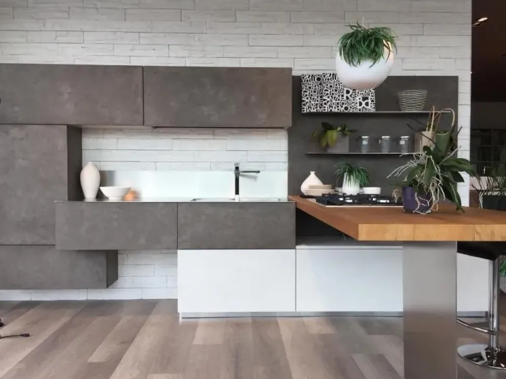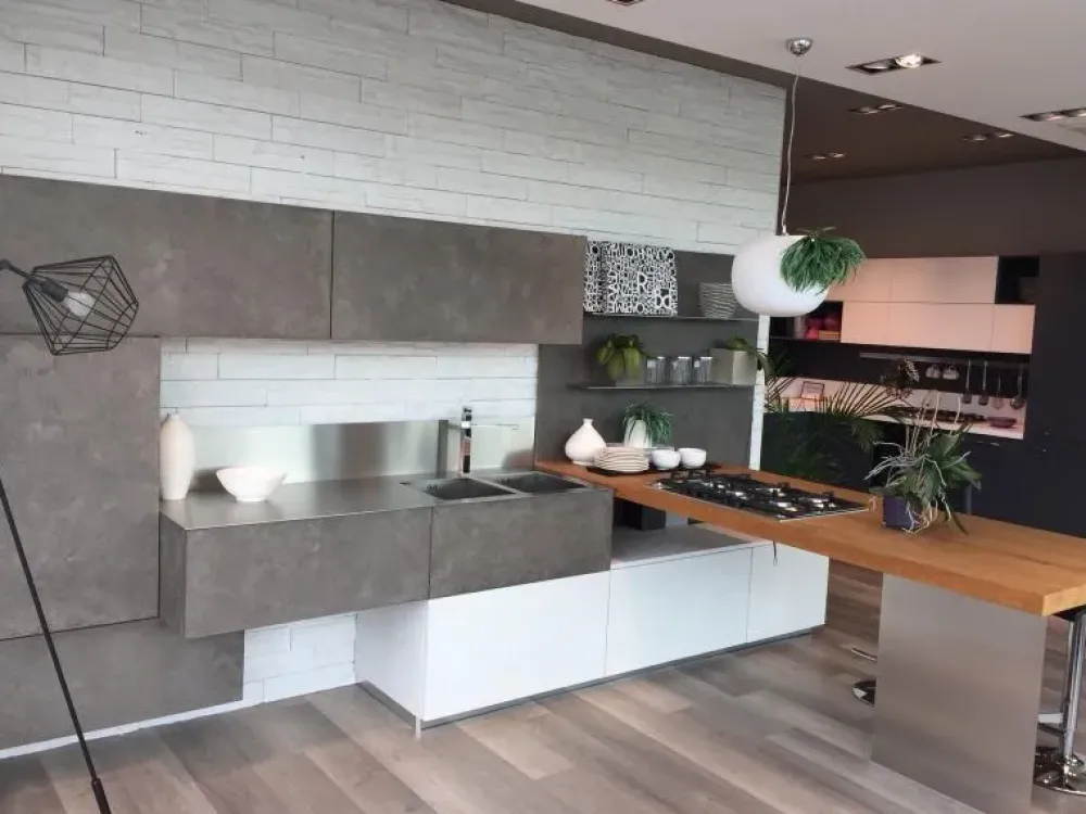 Top in acciaio spazzolato con vasca integrata Barazza. Penisola impiallacciata rovere.