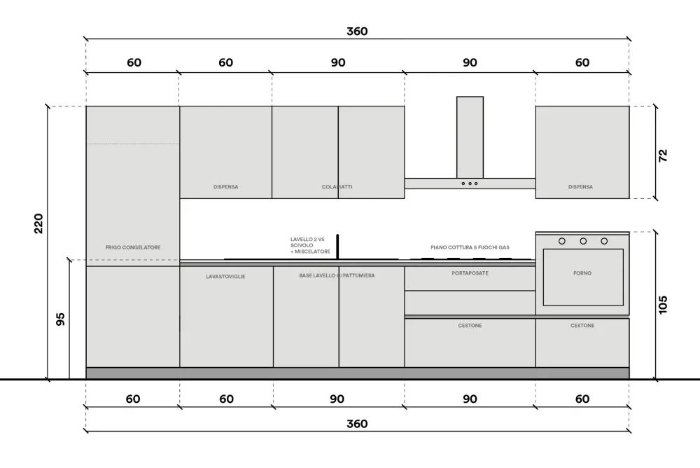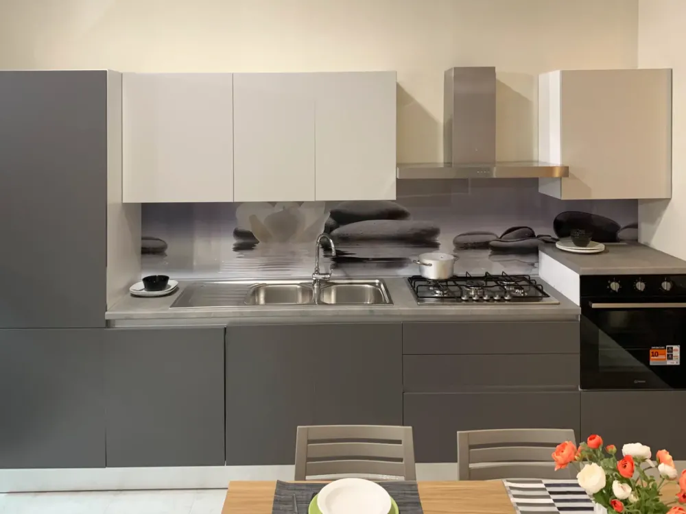 Cucina lineare 360 cm, sistema apertura gola, ante colonne e basi laminato grigio titanio, ante pensili grigio dorian, top laminato sp. 4 cm, zoccolatura e alzatina finitura acciaio, completa di elettrodomestici.