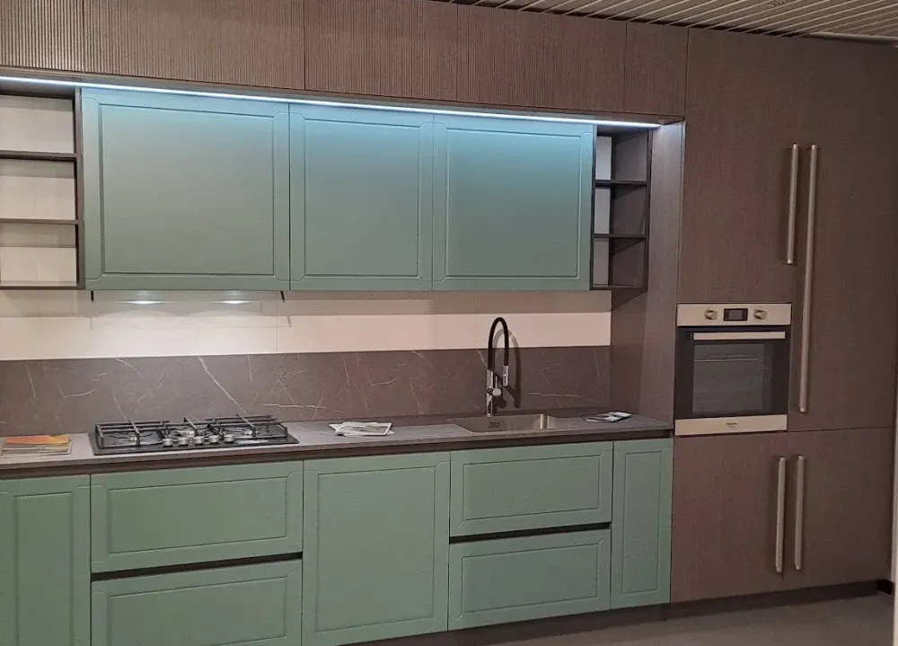 Cucina Myriad, Una rivisitazione contemporanea del telaio proposto e pensato in versione minimale ed accattivante. Finiture Laccato salvia opaco e laminato rigatino.