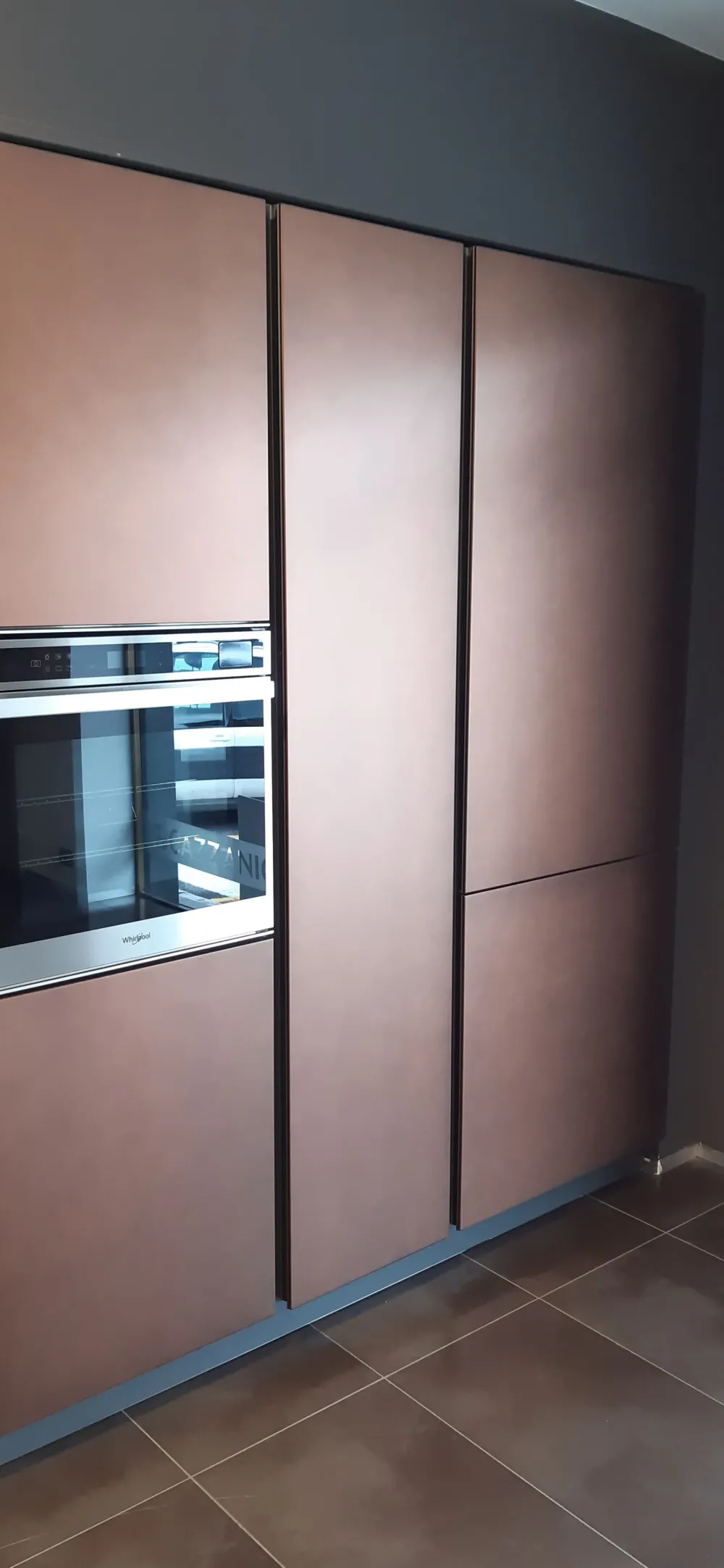 Le colonne dispensa sono dotate di illuminazione a LED, che non solo esalta la bellezza dei materiali, ma garantisce anche una visibilità ottimale all’interno degli spazi di stoccaggio. Gli interni in laminato antracite aggiungono un tocco di eleganza e resistenza, mentre le gole e lo zoccolo in metallo color moka shine completano il look con dettagli raffinati.
