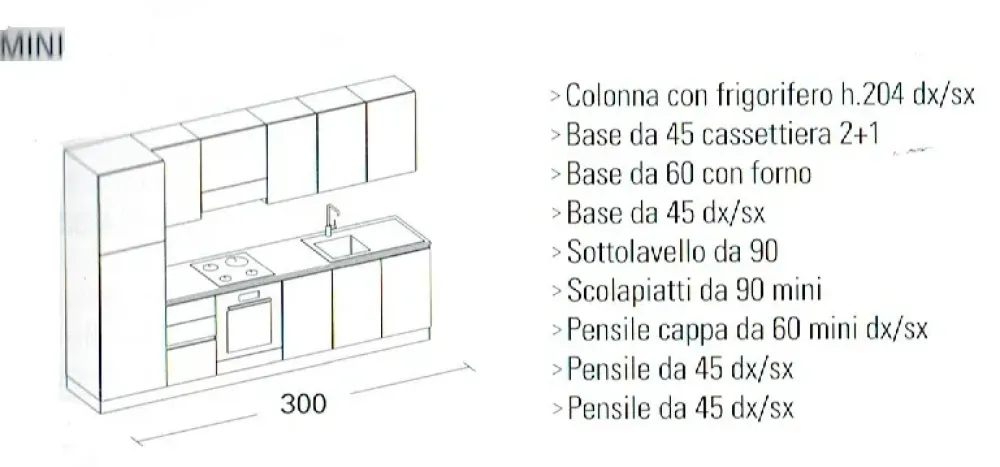 Cucina modello Loft marchio Arrex, composizione con misura bloccata con possibilità di variare elementi senza sovraprezzo. Possibilità di variare anche le finiture. Comprensiva di 1 colonna 5 basi di cui 1 con cestone e pensili. Sono inseriti elettrodomestici Electrolux in promozione e top in laminato. Trattasi di composizione tipo modificabile . Dimensione cm. 300 X p.60 x h.220 . Trasporto e montaggio da valutare.Rivenditori autorizzati Arrex .Cucine su misura e componibili non esitate a contattarci per un preventivo.