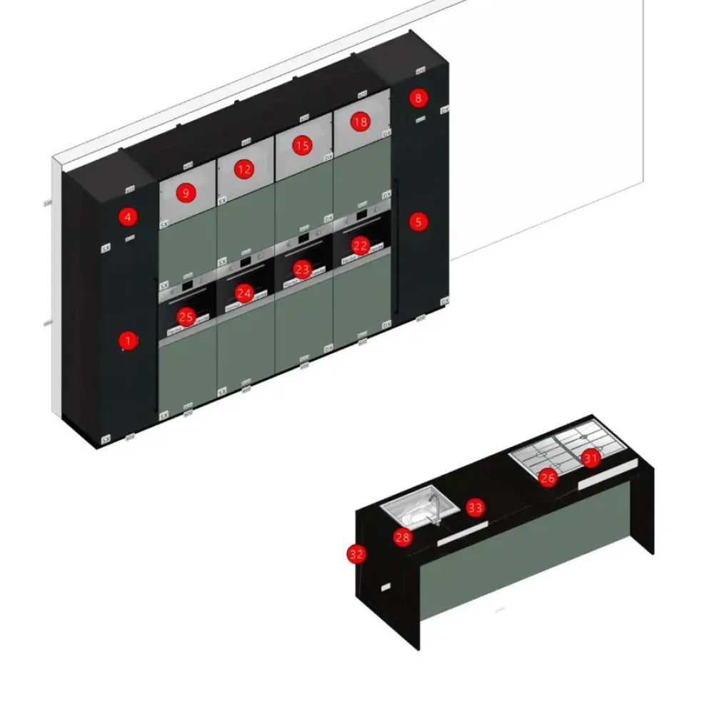 - Dimensione totale parete: 360 cm composta da 6 colonne da 60 cm : di cui 1 frigorifero, 4 da incasso elettrodomestico ( modificabile in base alle esigenze) e 1 dispensa con cassetti interni H colonne: 256cm