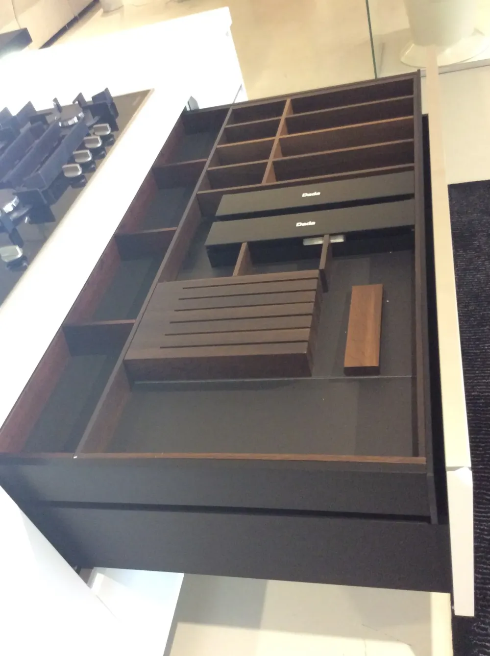 La nostra composizione si completa con un piano in quarzo bianco si spessore 5 cm cestelli estraibili angolo con magic corner penisola in rovere nero retro illuminata accessori interni Dada e chi più ne ha più ne metta, assolutamente full optional.