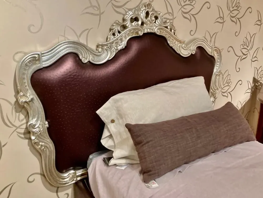 Letto Di Liddo & Perego modello Chic da 1 piazza con contenitore testata rivestita ecopelle viola con cornice argento. Dimensioni: TESTATA L. 145 H. 131 da terra, GIROLETTO L. 98 P. 205