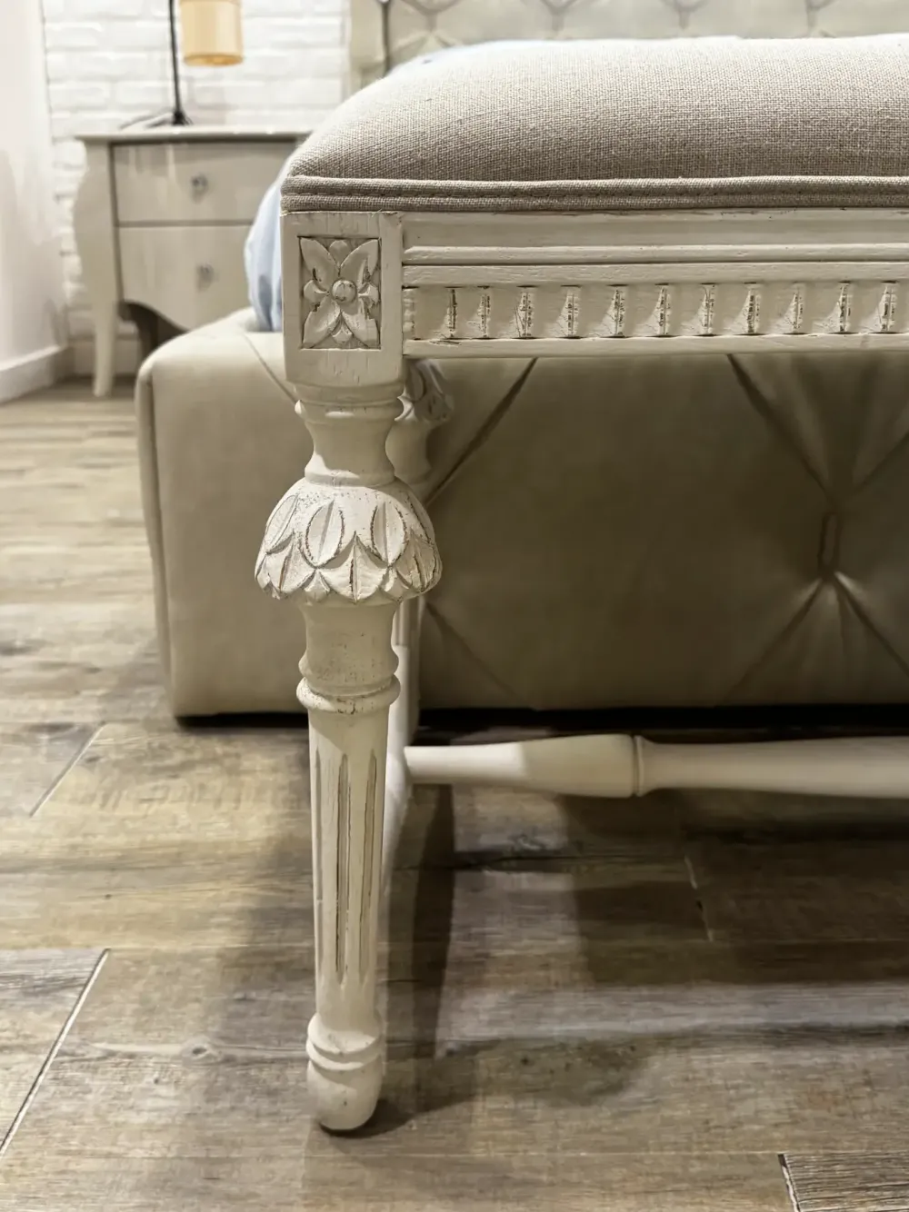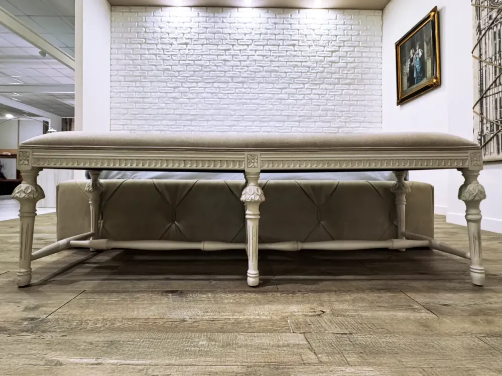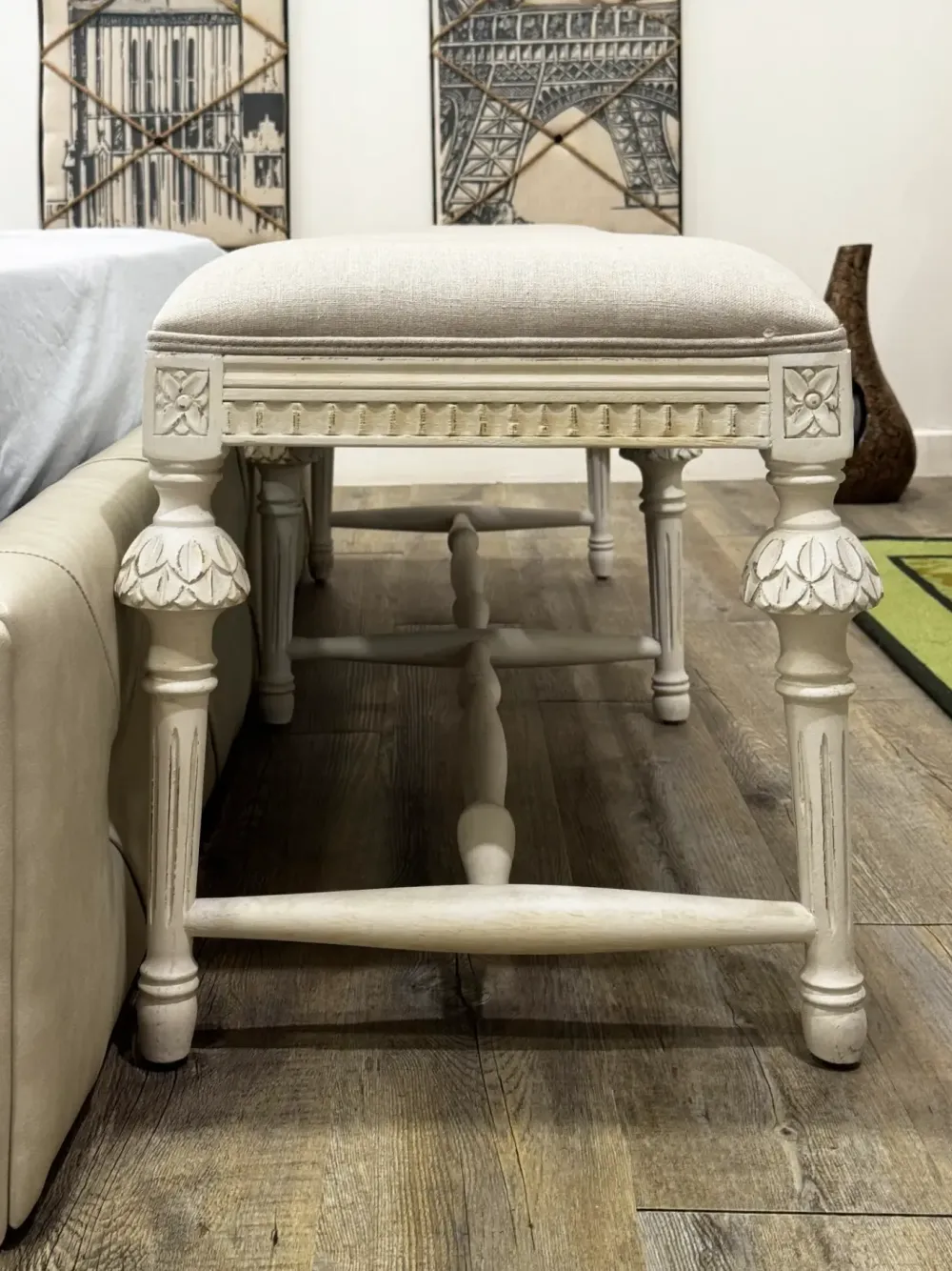 Perfetta in ambienti in stile shabby chic, provenzale o classico moderno. Lo stile raffinato e la finitura antica la rendono ideale per ingressi eleganti, fine letto, angoli salotto più formali. Struttura in legno massello laccato bianco, rifinito con una patina vissuta che conferisce al mobile un fascino d’epoca. Linee eleganti, dettagli intagliati e gambe leggermente tornite, che rimandano al design classico e regale. Seduta imbottita fissa rivestita in tessuto écru di alta qualità. Le dimensioni contenute la rendono versatile e adatta anche a spazi ridotti, evidenziando una presenza decorativa senza ingombrare.