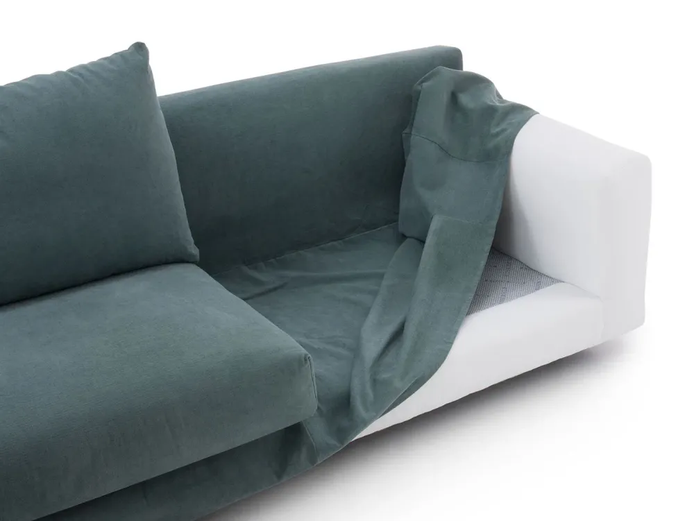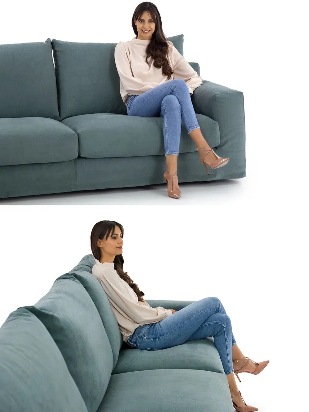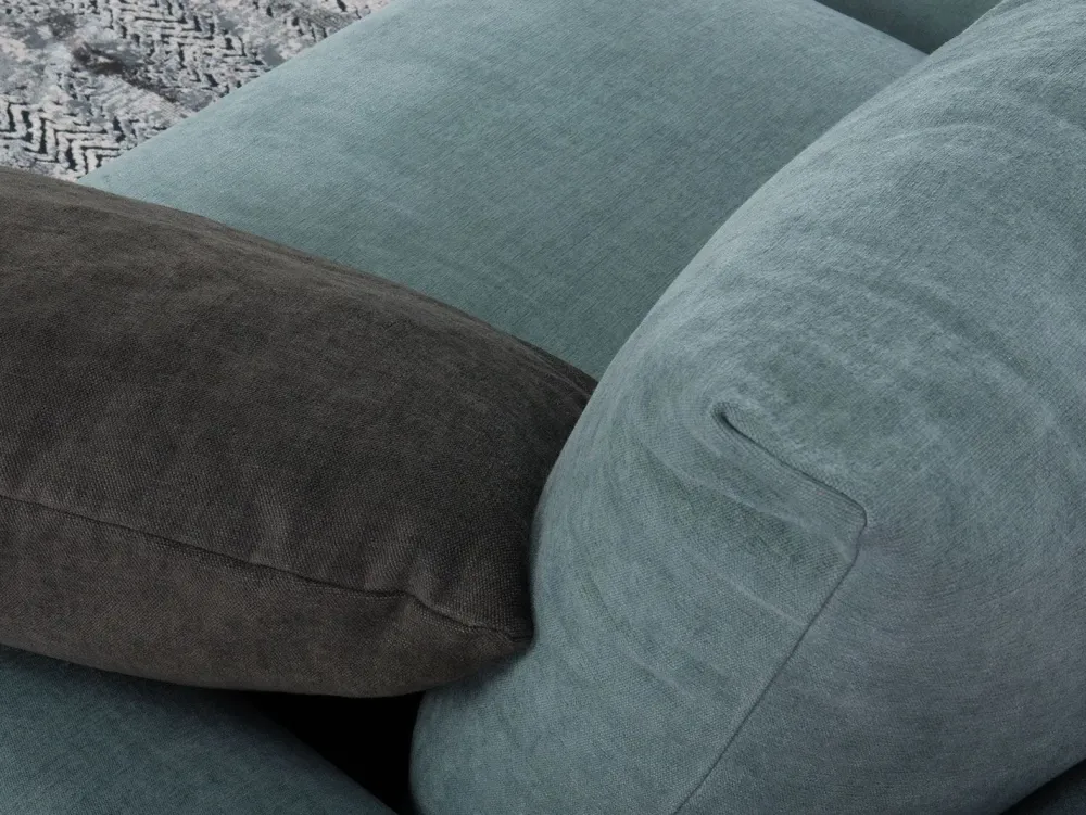 Lo stile è contemporaneo, con volumi pieni e generosi: i cuscini di seduta sono abbondanti, imbottiti con espanso e fibra effetto piuma, mentre quelli di schienale sono imbottiti con vera piuma, offrendo morbidezza e comfort. I piedini bassi sono nascosti dalla gonna della fodera, che non è fissata alla struttura del divano, facilitando così la sfoderabilità.