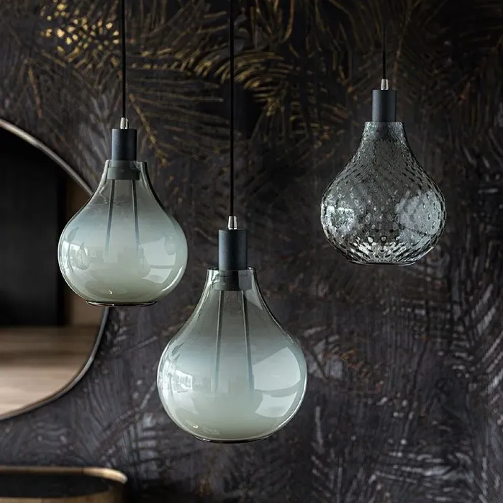 Con una composizione su più livelli, affiancando più di queste lampade in vetro, la zona living viene arricchita da un elemento decorativo raffinato ed equilibrato, capace di armonizzarsi perfettamente con arredi dalle linee morbide e generose.