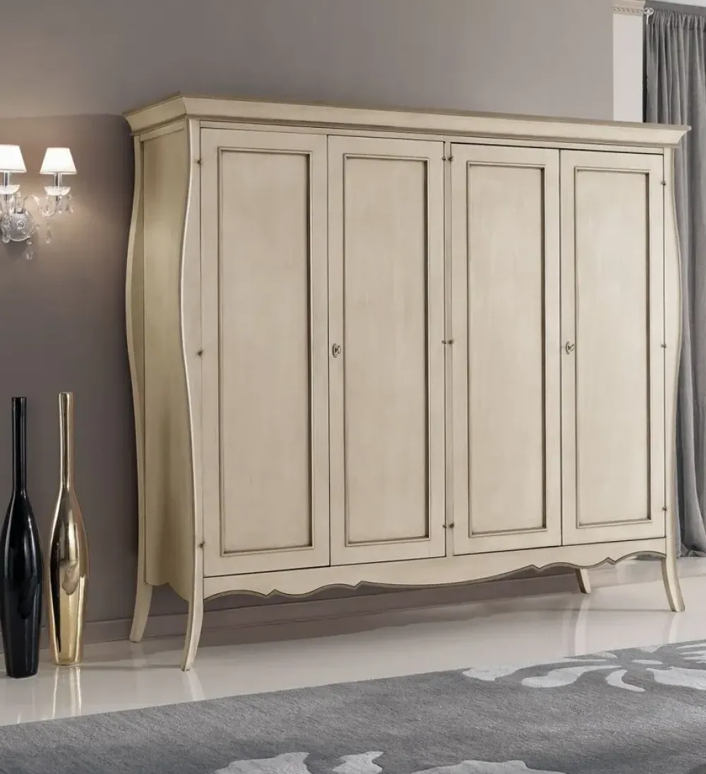 Armadio a 4 porte battenti l. 235 h.212 p.64 completo di 2 ripiani e 2 bastoni appendiabiti. Fianchi e cornice inferiori sagomati con 4 gambe anch’esse sagomate. Proposto in varie colorazioni il prezzo compreso il trasporto e Iva è di Euro 2.300,00. Tempi di consegna 30-40 giorni
