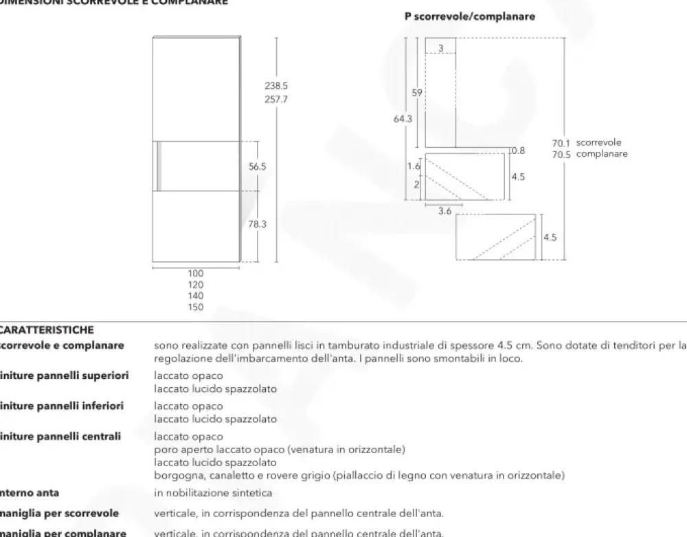 Le ante possono anche essere realizzate anche in laccato lucido, mentre il pannello centrale è disponibile oltre che in laccato opaco, in laccato lucido oppure in essenza.