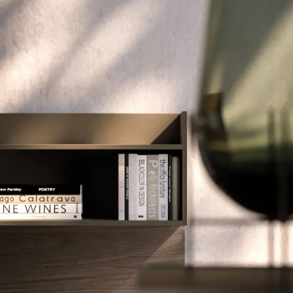 Elementi: Comodini e comò Compongo + Grafic in laccato opaco Terra e laccato metallizzato Cumino.