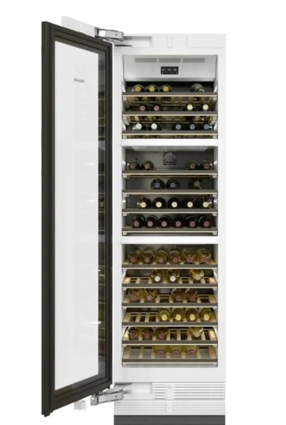 Cantina Mastercool, capacità del vano cantina max 104 bottiglie (di tipo bordolese), 13 livelli FlexiFrame in legno di faggio, sistema di ventilazione Dynacool per una perfetta circolazione dell’aria, sistema di apertura porta Push2Open per comparto frigorifero, apertura manuale del comparto congelatore, chiusura SoftClose dei cassetti, comandi MasterSensor con display full touch, 3 zone di temperatura separate, classe energetica G, illuminazione Brilliant Light, misure di nicchia in cm (L x H x P) 61,0 – 61,3 x 213,4 – 216,4 x 62,9, misure di prodotto in cm (L x H x P) 60,3 x 212,5 x 60,8, incernieratura a sinistra, possibile reversione cerniera in loco con apposito kit, cerniera piatta, volume utile totale 361 l, potenza sonora in dB(A) re1pW 42, funzioni smart (Miele@home per visualizzare e gestire l’elettrodomestico, WifiConn@ct possibilità di connettere l’elettrodomestico via wi-fi).