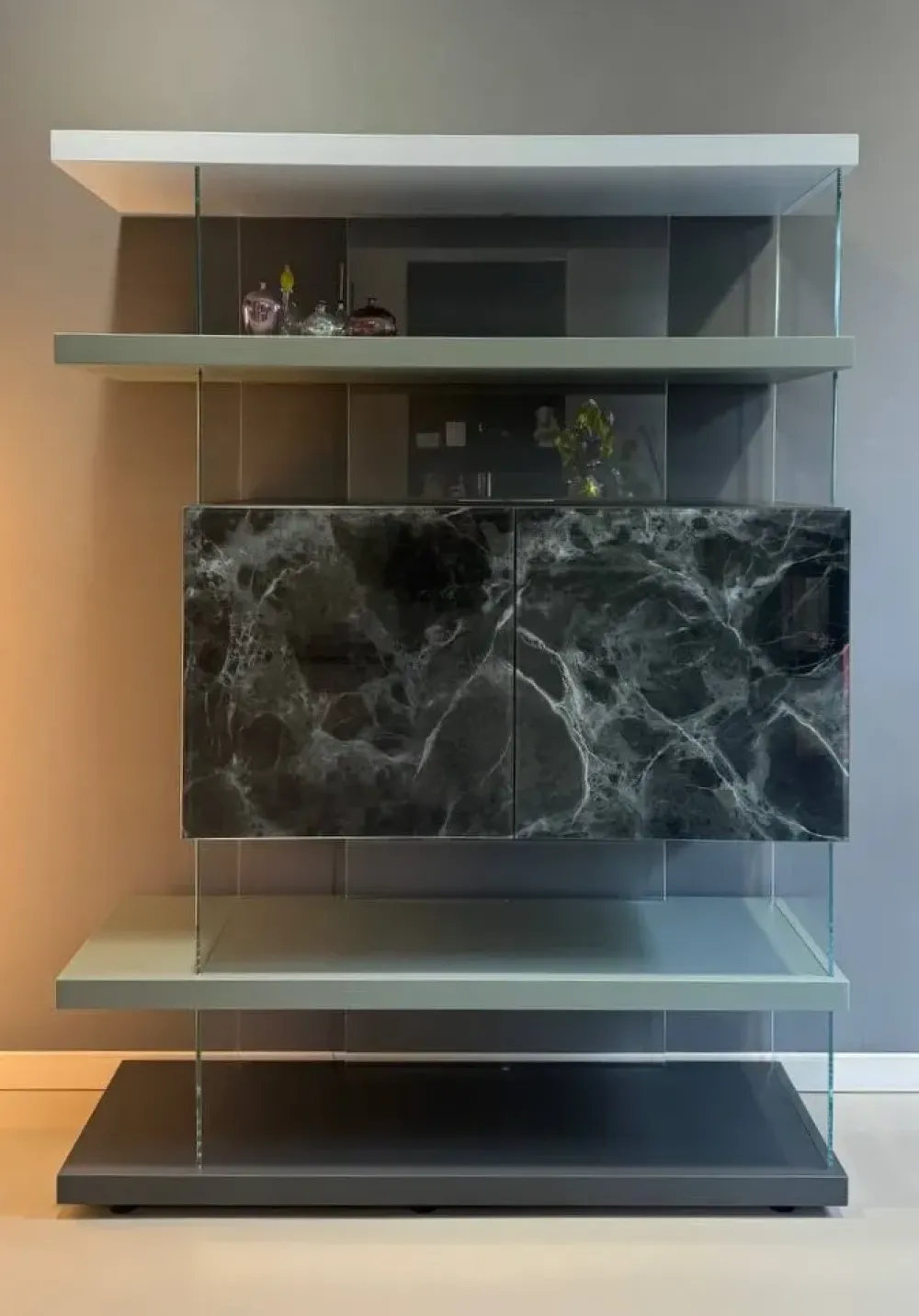 Leggera ma dal forte impatto visivo, colpisce per la raffinatezza delle sue finiture. Proposta con le mensole laccate grafite, argilla, artico e contenitore laccato grafite con frontale e schienale XGLASS lucido verde alpi.