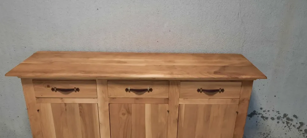 Madia a 3 ante completamente massiccia in legno di NOCE con maniglie in cuoio color testa di moro , impreziosita dalla finitura naturale all’ACQUA che risalta la marcata venatura del legno di noce e che lascia trasparire il colore naturale del legno. Anche gli interni dei cassetti e lo schienale sono totalmente massicci in legno di abete , il mobile risulta in questo modo essere massiccio al 100%. Ideale per accostamenti con ambienti moderni. Misure 180x48x108h