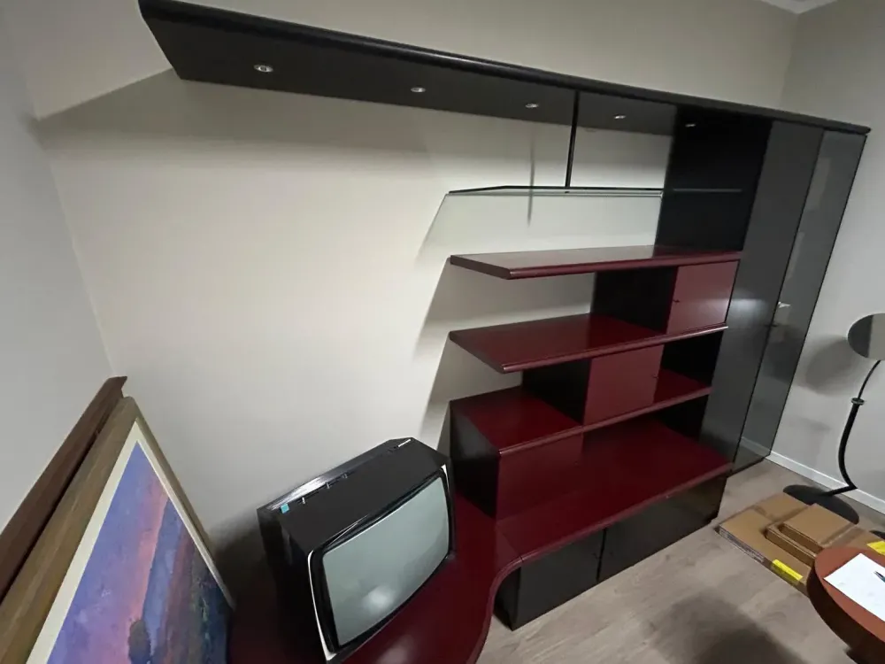 Parete soggiorno linea prestigio lunga cm.315320 circa, laccata opaca nera//bordeaux completa di mensolone con faretti, penisola sagomata porta Tv, vetrinetta, vani contenitivi, cassetti e cestoni ripiani in vetro e legno.