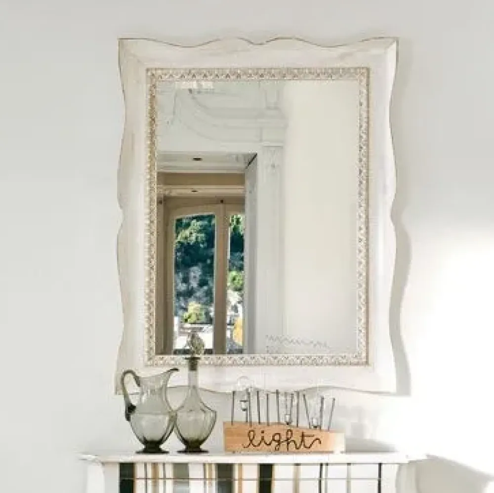 Marte è un elegante specchio con una cornice classica in legno, disponibile nella finitura “Glamour” (Legno) laccato bianco opalino, che prevede un procedimento aggiuntivo di invecchiamento del legno che gli conferisce un effetto puntinato e patinato.
