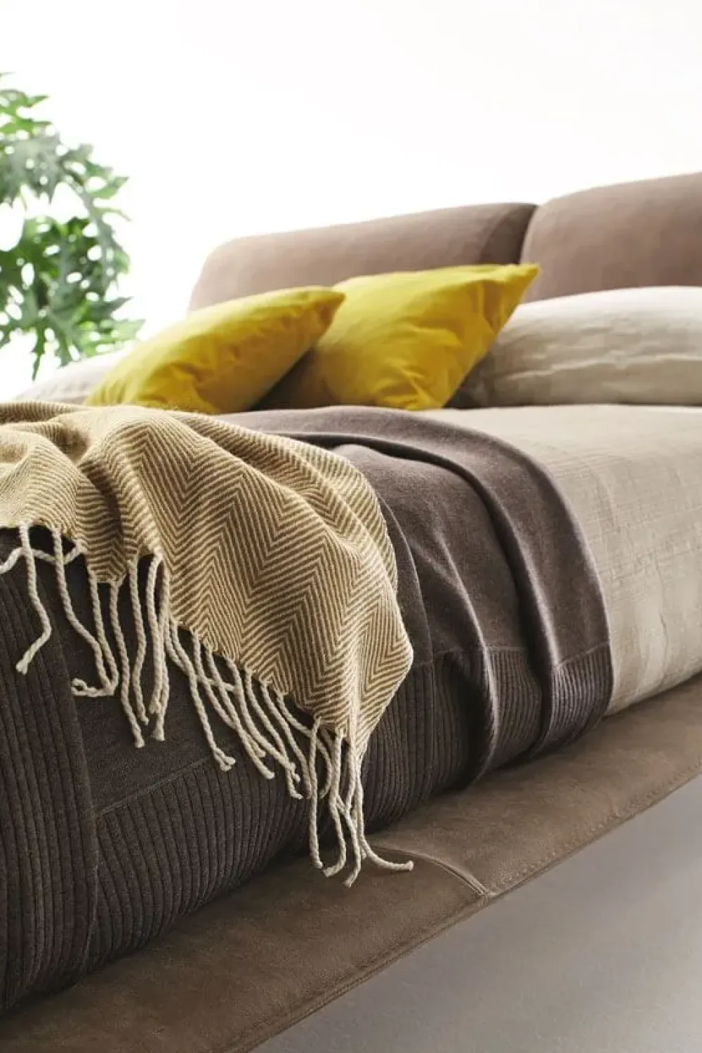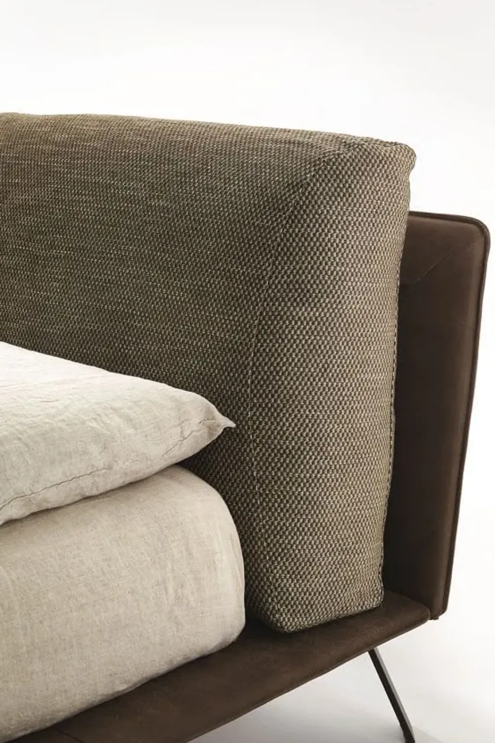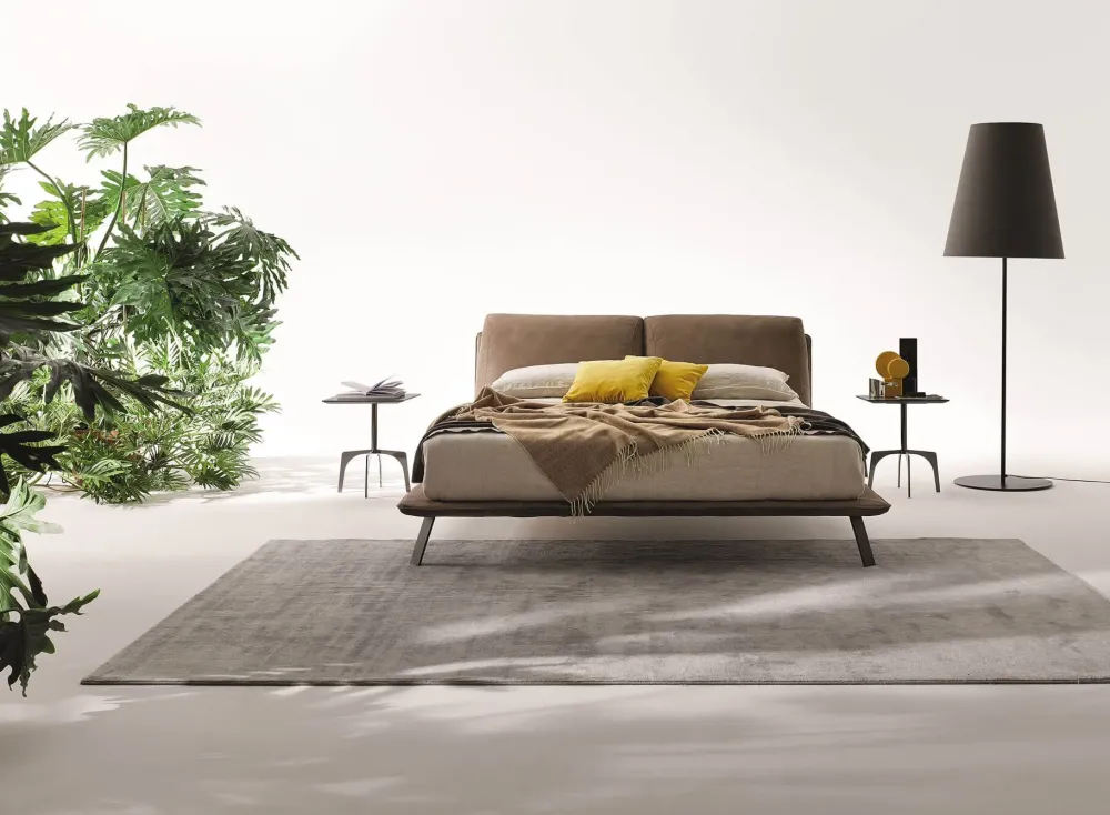I piedini in metallo si fondono con il sottile giroletto rivestito, creando un letto dallo stile inconfondibile.