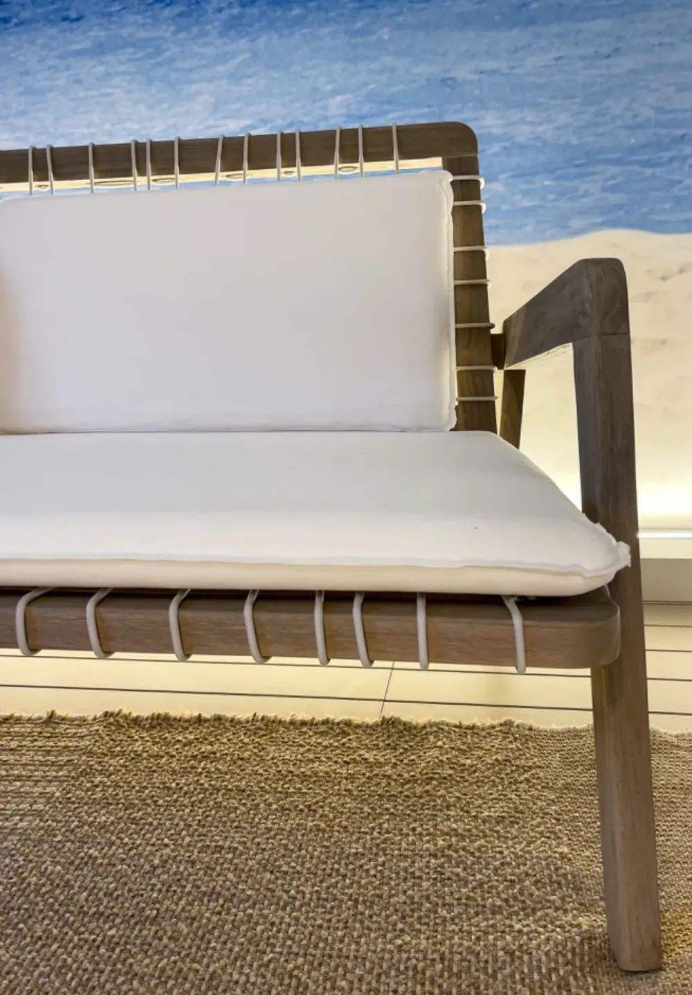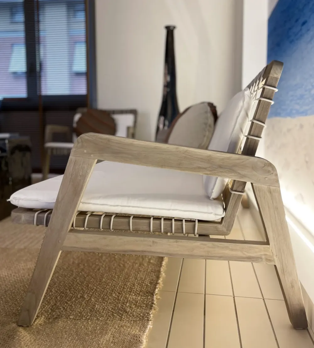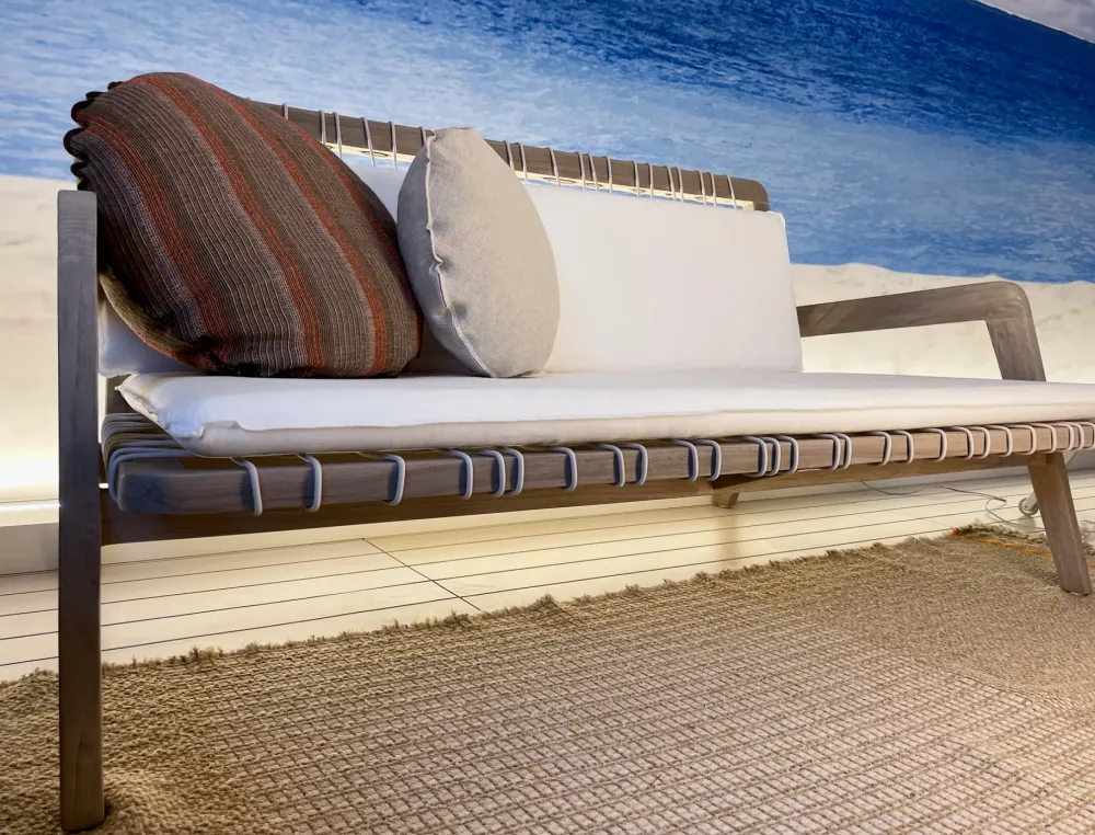 Grazie alla sua resistenza agli agenti atmosferici, il divano INOUT 863 è ideale per terrazzi, piscine e giardini, unendo la bellezza del legno naturale a un design moderno e ricercato.