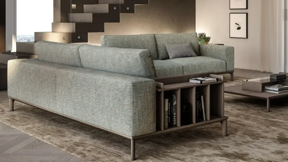 La struttura di questo divano è in listellare impiallacciato con rinforzi in tubo di alluminio, sedute indeformabili in poliuretano e schienali con miscela di fiocco di poliestere e piuma d’oca.