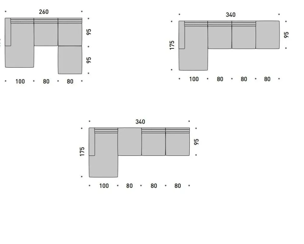 DIMENSIONI: Penisola 175 cm + centrale 80 cm + centrale 80 cm + pouf 80 cm