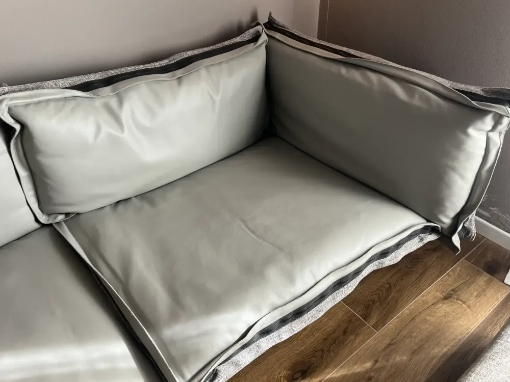 Cuscini reversibili, sia dello schienale che della seduta, con un lato in pelle Plus 4042 e un lato in e uno in tessuto categoria D Maze 4942, bordino nero.