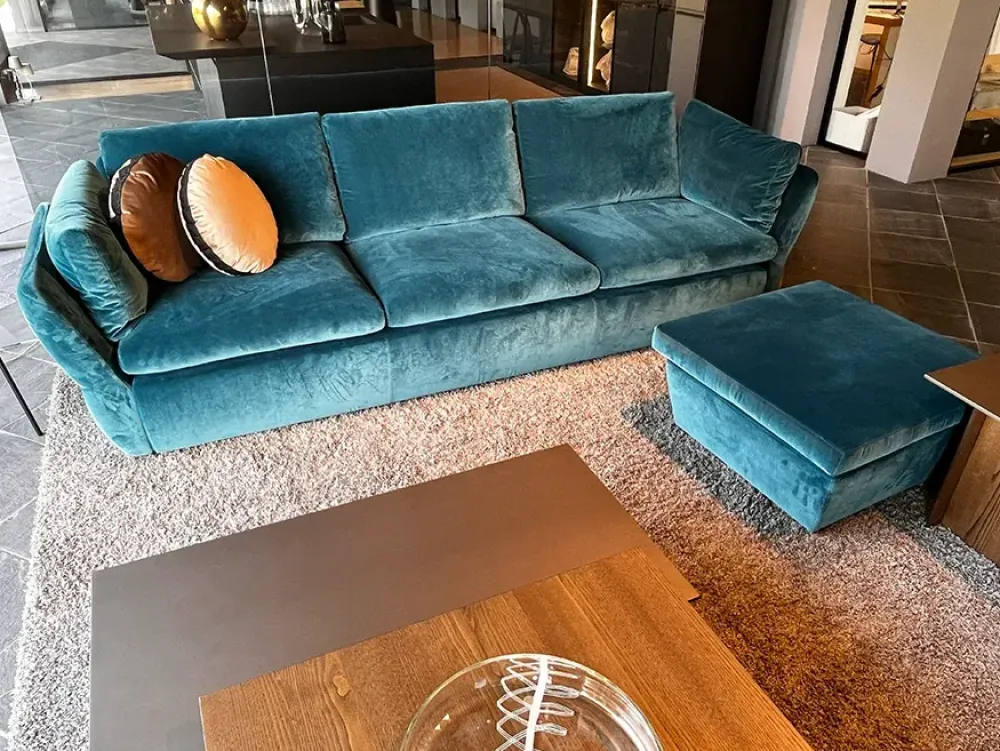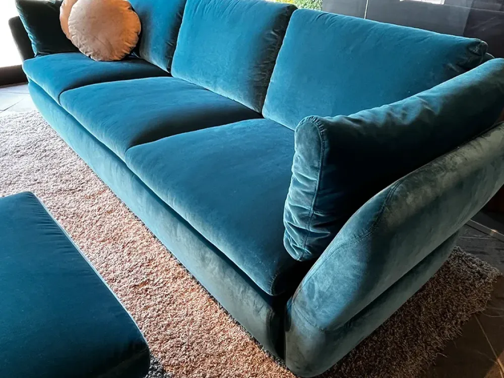 DIVANO MODELLO BUZ, COMPLETAMENTE SFODERABILE, IN TESSUTO VELVET 138 PETROLIO, COMPRESO DI POUF QUADRATO IN TESSUTO VELVET 138 PETROLIO E DI N.2 CUSCINI CON MONOGRAMMA ROTONDI IN TESSUTO VELVET 132 BRONZO.