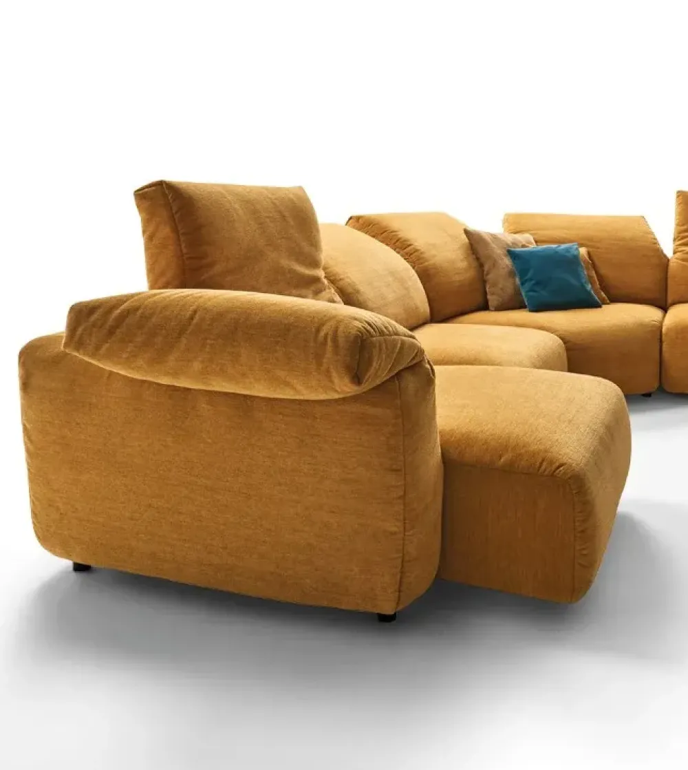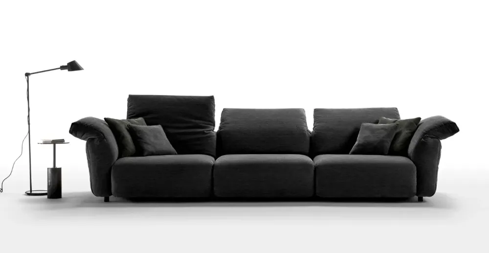 Nella versione tessuto il divano è completamente sfoderabile, mentre nella versione in pelle sono sfoderabili solo i cuscini di seduta. Il rivestimento dei cuscini spalliera e i cuscini seduta è in poliuretano espanso densità 24 per la spalliera e 35 per la seduta.