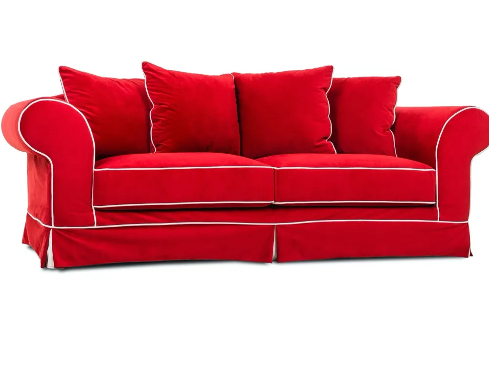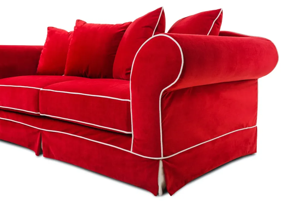 . PRESENTA IL DIVANO CLASSICO DAPHNE. DAPHNE E’ UN DIVANO IN STILE RETRO’ DALLE FORME ELEGANTI E ATTUALIZZATO DA PARTICOLARI CHE LO RENDONO COMODO E CONTEMPORANEO COME IL TESSUTO IN VELLUTINO ROSSO CON BORDINO BIANCO.