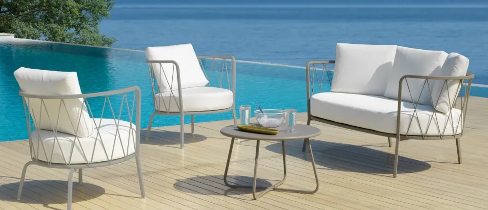 Salotto serie Vermobil mod. DAISY in ferro zincato col tortora , composizione composta da divano a 2 posti, 2 poltrone e 1 tavolino. Completo di cuscini sfoderabili e tessuto idrorepellente. Disponibile anche in altre versioni di colore.