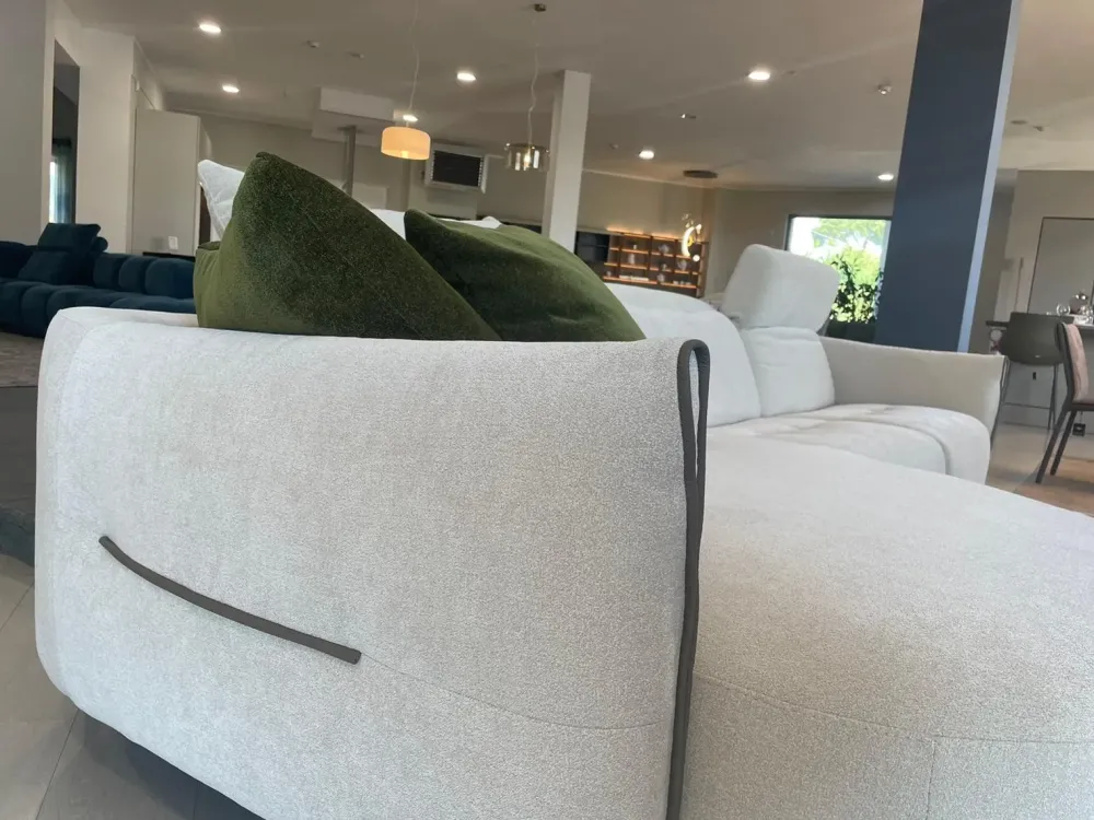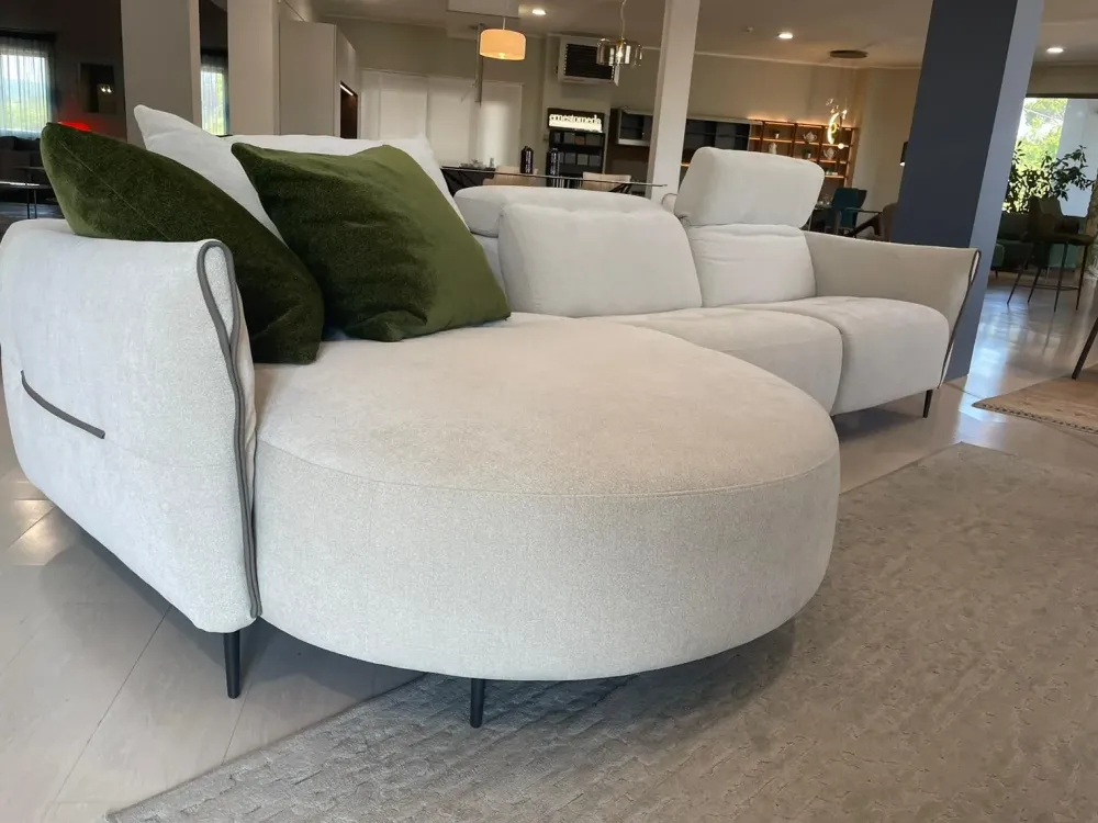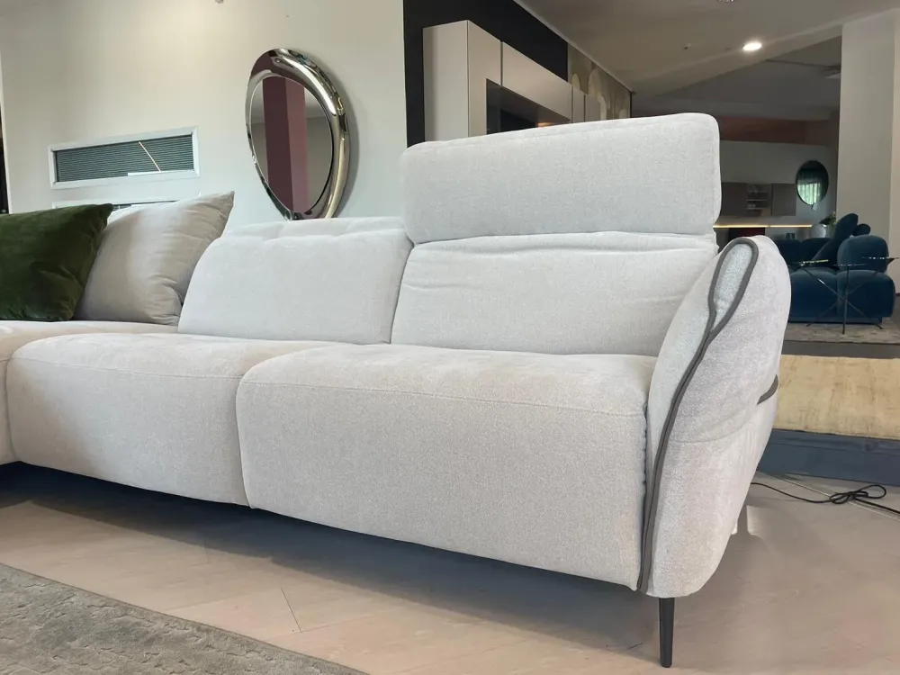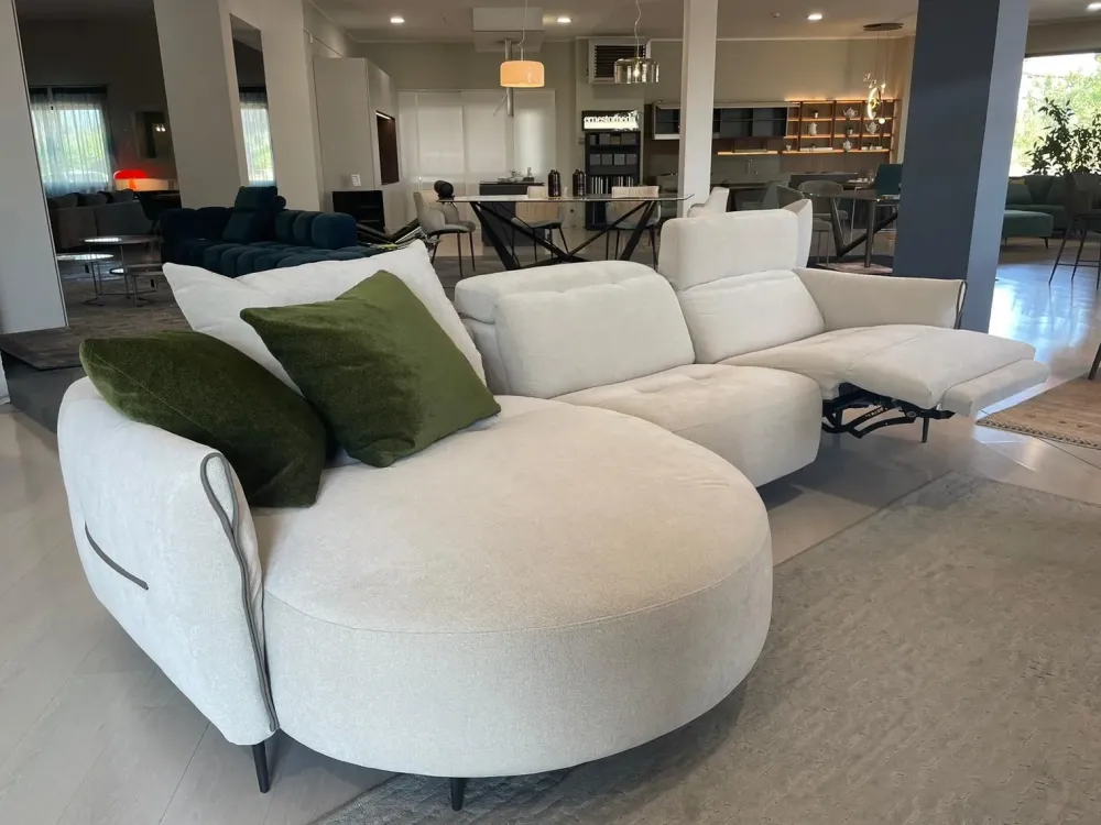 Divano con penisola semicircolare, e due sedute, una fissa e una relax elettrica. Entrambe con poggiatesta reclinabile.