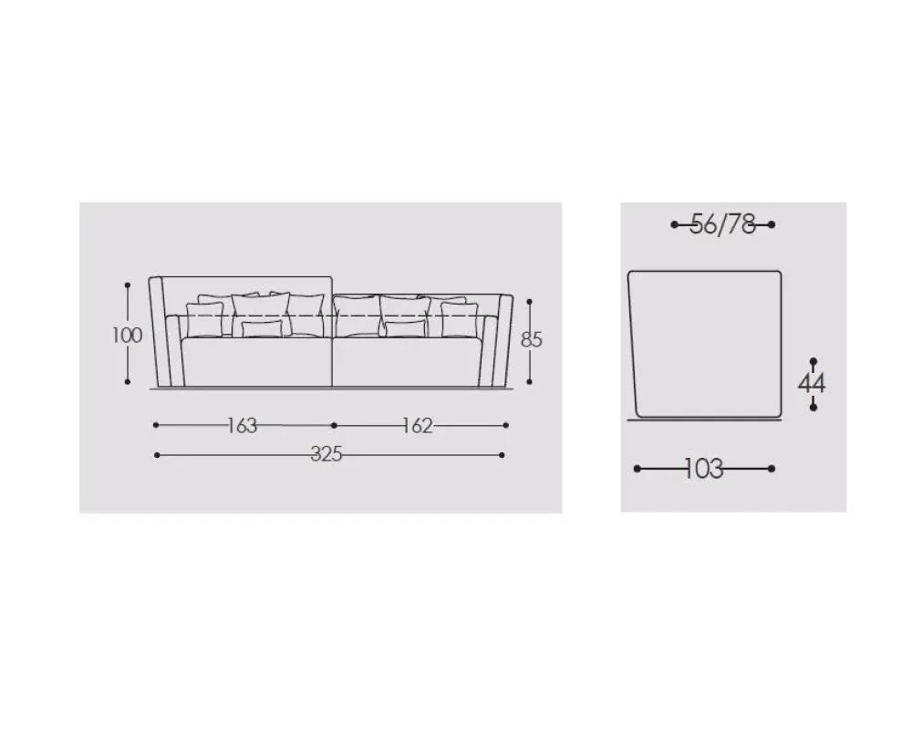 - I locali interni devono essere conformi alle necessità di chi li vive e i mobili, tra cui pure gli imbottiti, non devono mai risultare ingombranti; il modello qui presente è appartenente alla fascia di imbottiti di lunghezza che va da 301 a 325 cm, risultando così ideale per un interno di molteplici volumetrie.