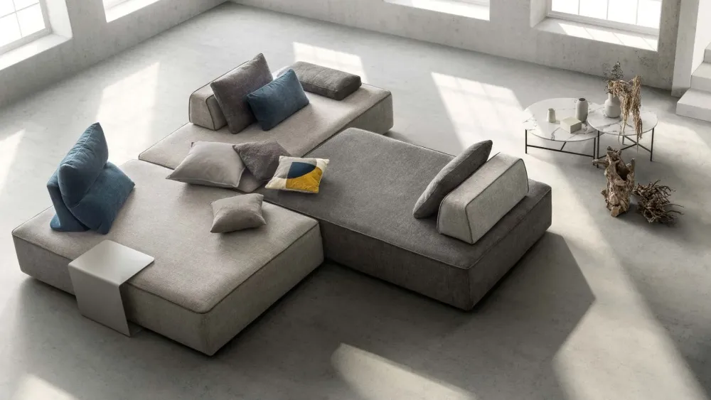 Vi presentiamo il divano Jest ad angolo componibile composto da 1 modulo L 175 x P. 125 x H 43/93 cm e 1 modulo L 195 x P 125 x H 43/93 cm + 3 pacchetti schiene modello Tilt Il costo si riferisce alla categoria A .Finitura Line a richiesta .