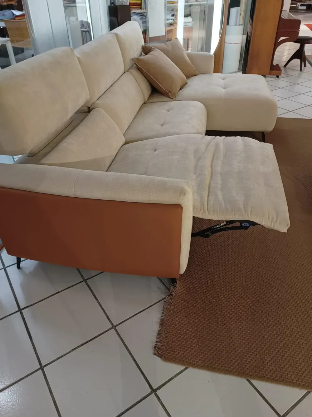 La Scala è un divano che interpreta il relax con soluzioni tecnologiche avanzate e linee avvolgenti. Le forme morbide si uniscono al sistema MOTION³, che grazie ai tre motori indipendenti regola con precisione spalliera, seduta e poggiatesta. Il comfort lombare dedicato e la possibilità di personalizzare ogni posizione rendono questo modello un autentica oasi di benessere domestico. Rivestimento in tessuto ecrù con trattamento antimacchia, fianchi divano in ecopelle colore cuoio.Elemento laterale con movimento elettrico con comandi del movimento integrati nella seduta. Dimensioni divano cm 280 prof. cm 90 per la seduta e profondità cm 160 per la penisola.