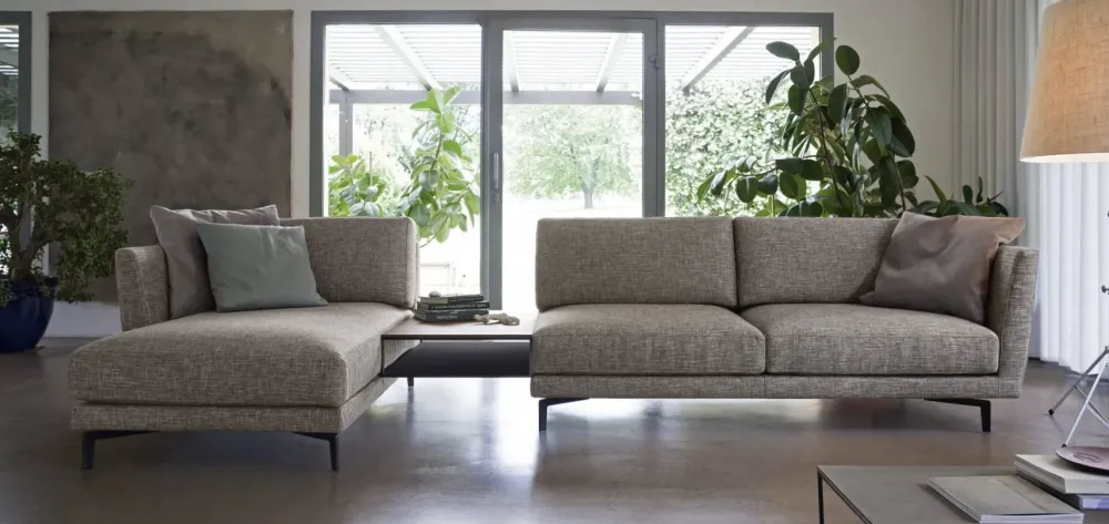 - Divano componibile con possibilità di integrazione di tavolini rettangolari o sagomati in metallo con piano in rovere cenere o canaletto, per creare movimento tra gli elementi della composizione.