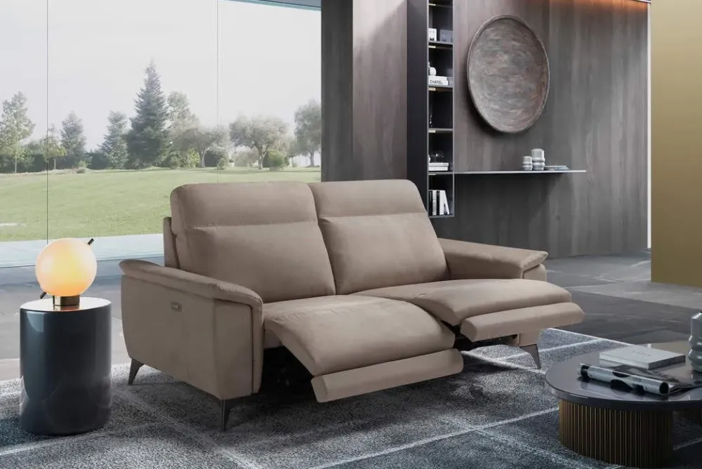 Divano tre posti con due recliner elettrici, piedi in metallo col.Titanio H13.5 cm, tessuto Elegant wave col.000/15.