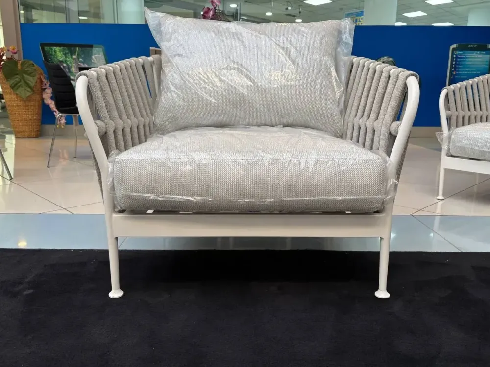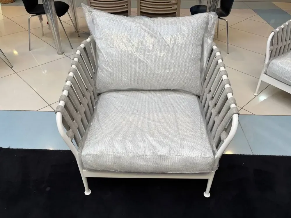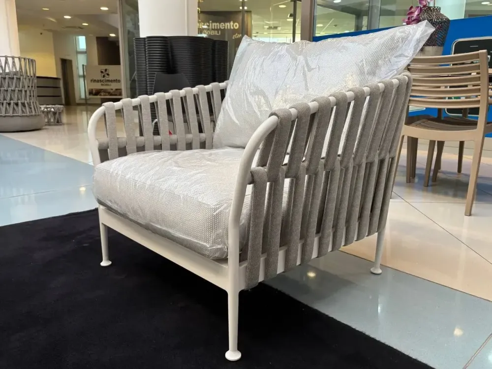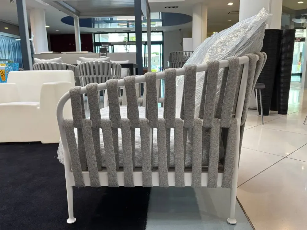 Struttura in alluminio col. bianco; Schienale con cuscinatura e corde imbottite intrecciate col. grigio.