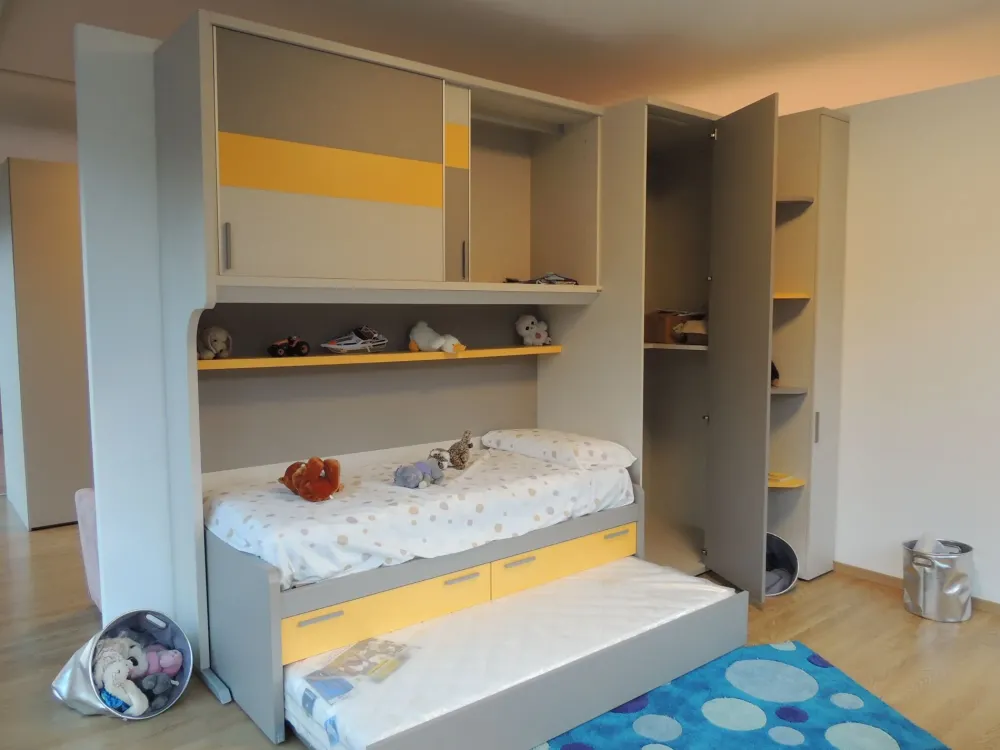 Cameretta a ponte con Cabina armadio collezione “Qik”, nelle finiture Tortora ,fango e Zafferano di misure: Lato Letto: L 363,9 x H. 270 x P. 60 Lato Terminale: L. 136,4 x H. 270 x P. 60 Letto Giotto con secondo letto estraibile.