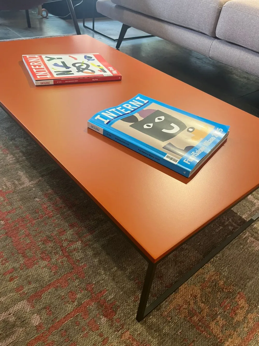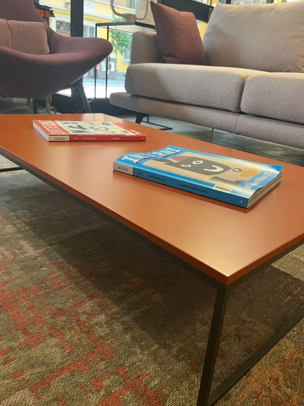 Tavolino Nexus, bronzo vintage. Piano laccato arancio mattone 057.